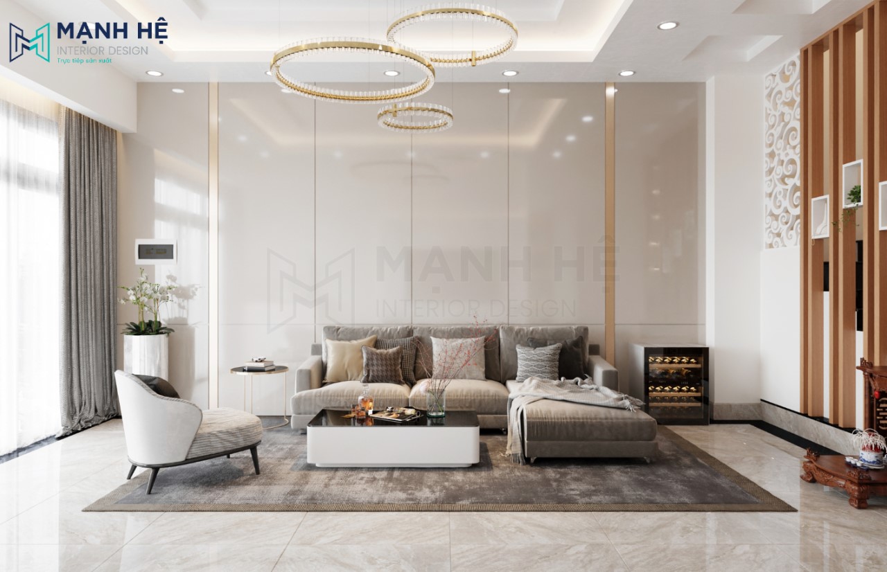 Vách ốp tường phủ acrylic sáng bóng kết hợp thêm đường ron vàng tinh tế. Ánh sáng đèn led âm trần kết hợp đèn trần thả sẽ giúp phòng khách thêm sáng sủa và thu hút hơn. Bố trí bộ ghế sofa chữ L gam màu xám cùng bàn trà và thảm lót tinh tế. Hệ tủ rượu nhỏ ở góc sẽ tăng tính sang trọng cho phòng khách.
