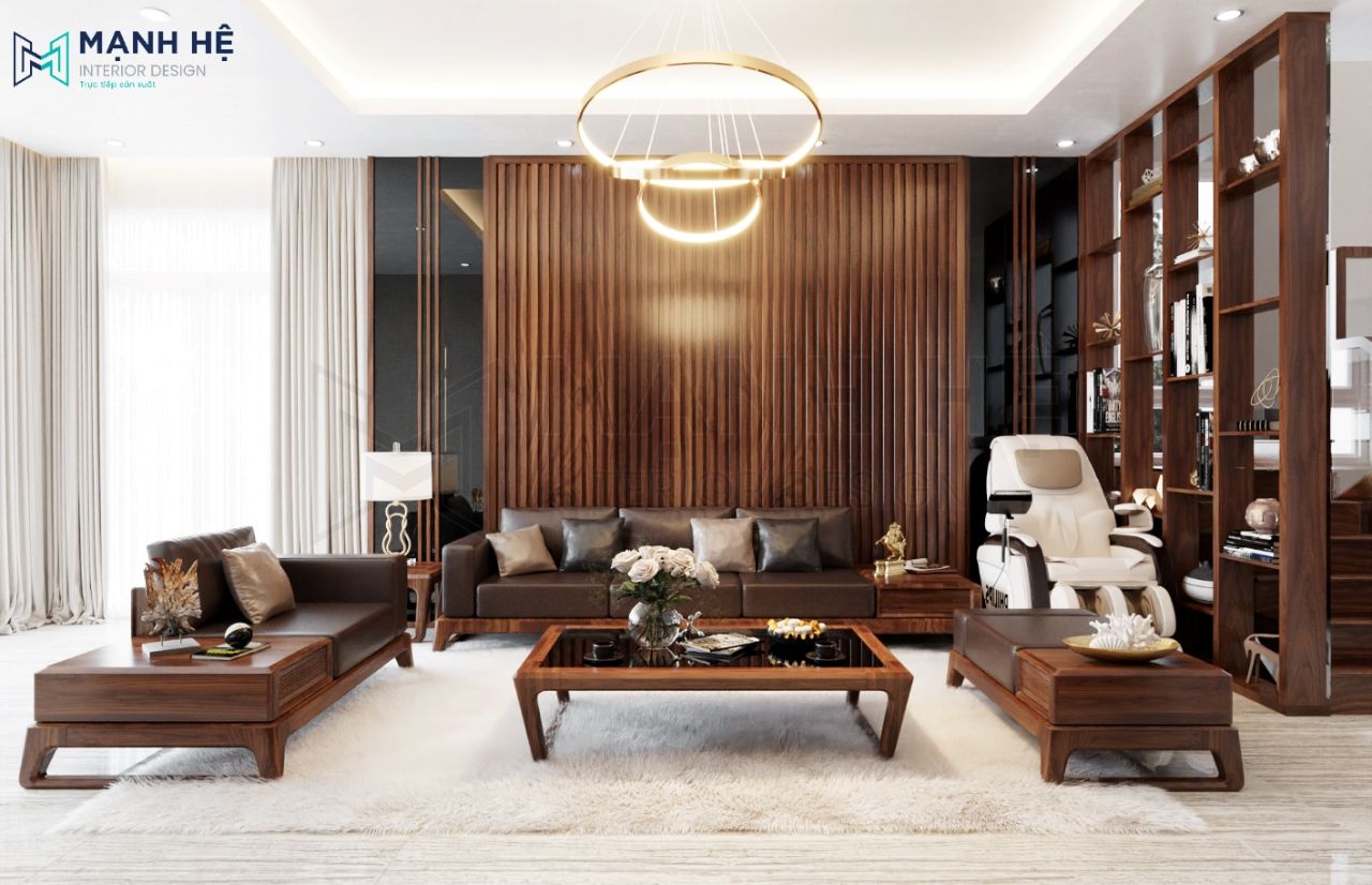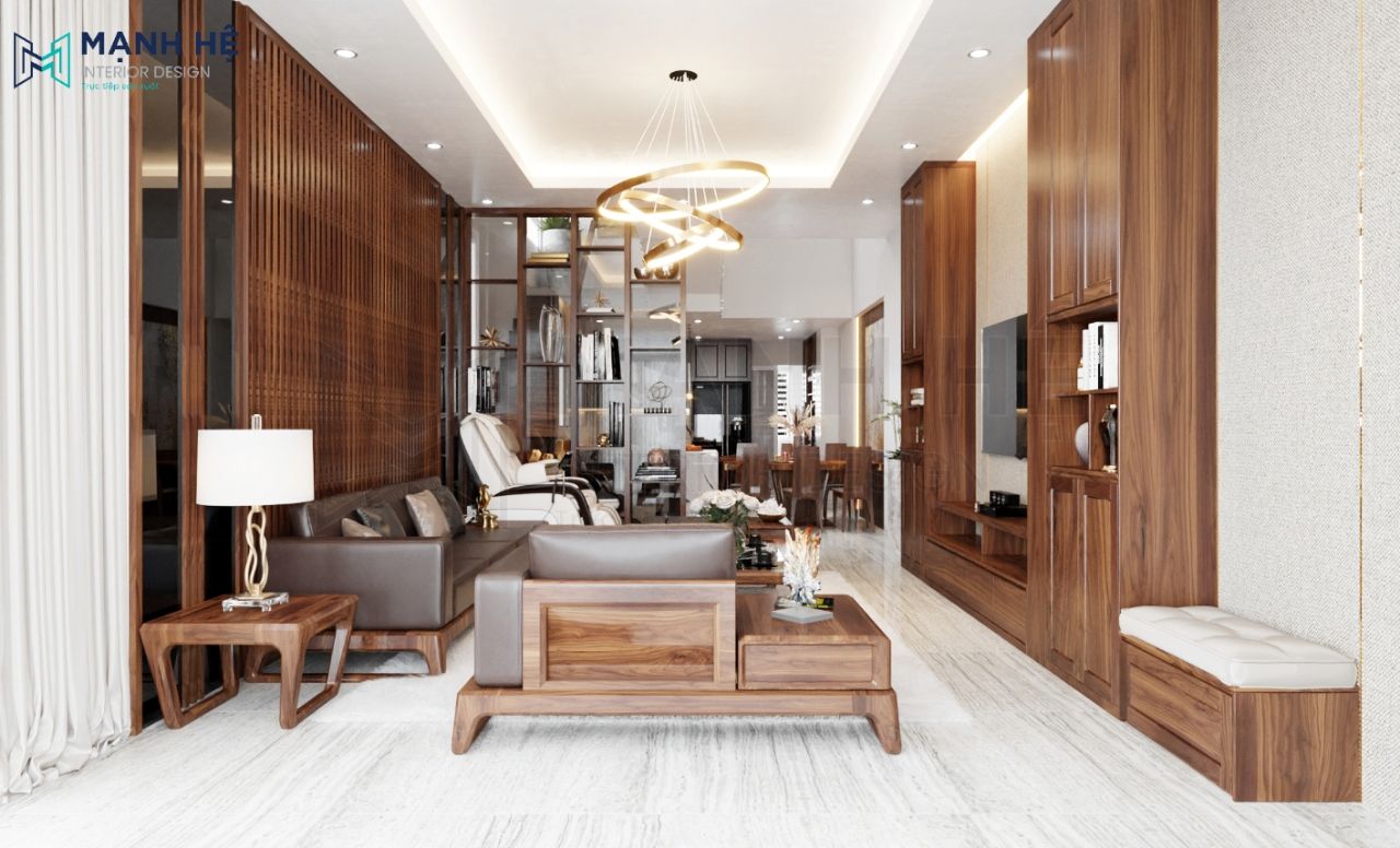 Nội thất phòng khách tone màu nâu trầm của gỗ sang trọng, quý phái đồng thời tạo cảm giác gần gũi và ấm cúng. Không gian sang trọng, ấm cúng giúp gia chủ dễ dàng tiếp đón khách và thuận tiện sinh hoạt trong gia đình.