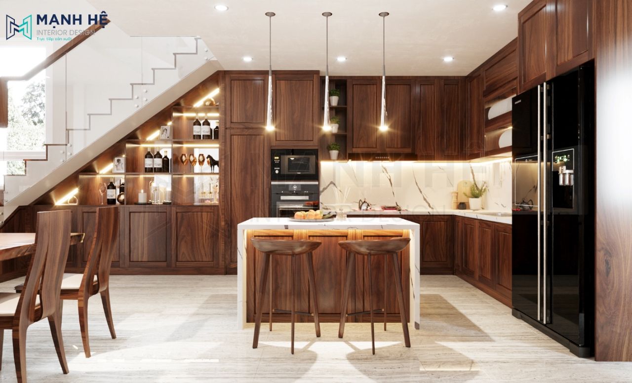 Thiết kế hệ tủ bếp dạng chữ L sang trọng, đầy đủ tiện ích giúp gia chủ thể hiện đam mê nấu nướng. Tích hợp thêm tủ bao tủ lạnh vào chung hệ tủ bếp. Vị trí trung tâm bếp, bố trí bàn đảo cực tiện lợi có thể tận dụng làm một chiếc bàn ăn vô cùng độc đáo. Ngoài ra, bàn đảo bếp giúp tăng thêm không gian lưu trữ và cân đối không gian nhà bếp.