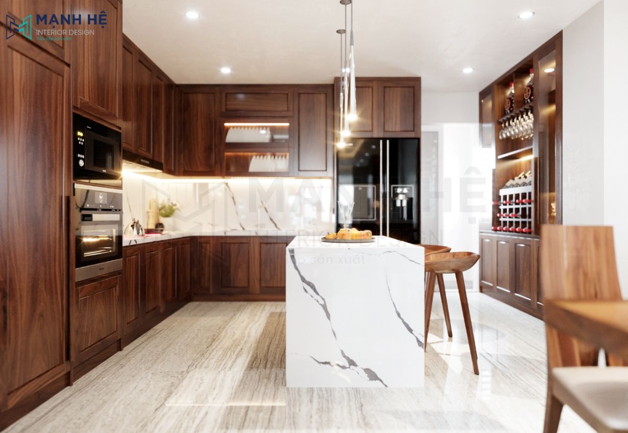 Sử dụng gạch vân mây làm vách ốp bếp đồng thời làm bàn đảo bếp sang trọng, sạch sẽ, giúp gia chủ tiện lợi lau chùi. Đèn thả trần tô điểm thêm vẻ thẩm mỹ cho phòng bếp. Bố trí tủ rượu âm tường kết hợp chất liệu gỗ và cửa kính tôn lên vẻ cao cấp, quý phái của những chai rượu đồng thời thể hiện đẳng cấp của gia chủ.