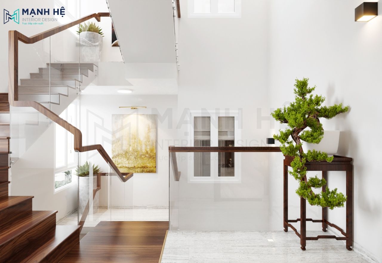 Thiết kế tay vịn cầu thang và bậc cầu thang làm bằng gỗ tự nhiên sang trọng, hiện đại. Bố trí nhiều cửa sổ thoáng mát, không gian ngập tràn ánh sáng. Bố trí bàn gỗ đơn giản giúp trang trí cây cảnh tăng thêm vẻ mỹ quan cho ngôi nhà. Mang lại không khí thư giãn, trong lành với màu xanh dịu mát của cây cối.
