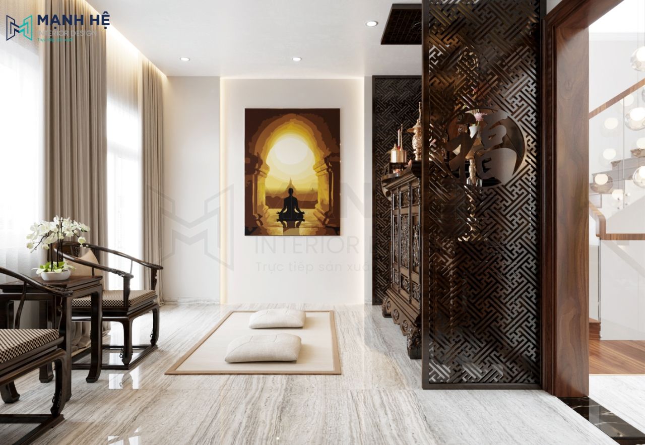 Bàn thờ được thiết kế với nhiều họa tiết cầu kì, tinh xảo tăng thẩm mỹ và đẳng cấp của căn phòng. Đối diện bố trí bộ bàn ghế kiểu cổ xưa sang trọng, quyền quý.