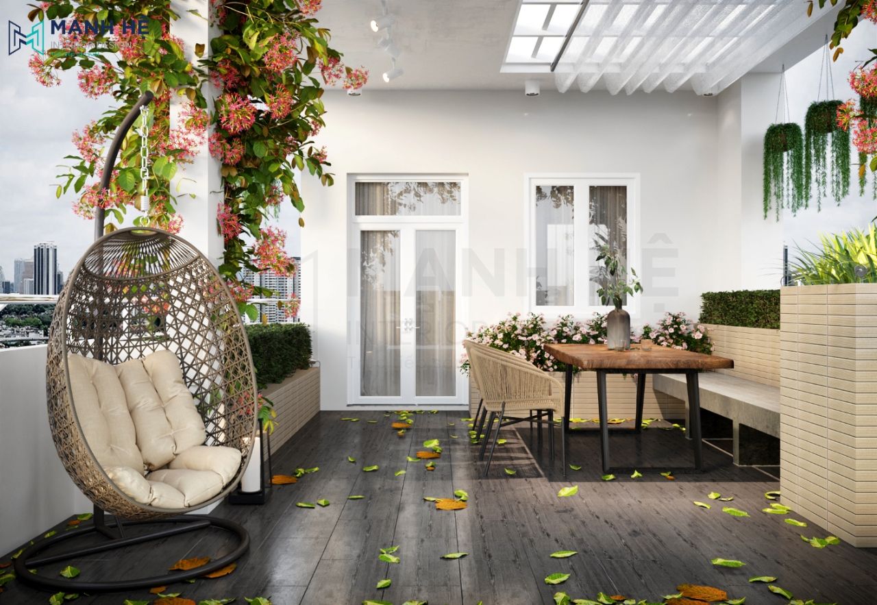 Phía trên thiết kế lam gỗ tận dụng đón nhiều ánh nắng nhất. Ngoài ra còn là nơi để các dây leo phát triển tăng vẻ thẩm mỹ, không gian lãng mạn. Màu sắc nhã nhặn lãng mạn với phong cách nội thất tối giản, giúp cho người nhìn cảm thấy rộng rãi, thoáng đãng. Không gian hoàn hảo cho gia chủ có những buổi chiều chill đọc sách, uống cafe và tận hưởng vẻ đẹp của thành phố.