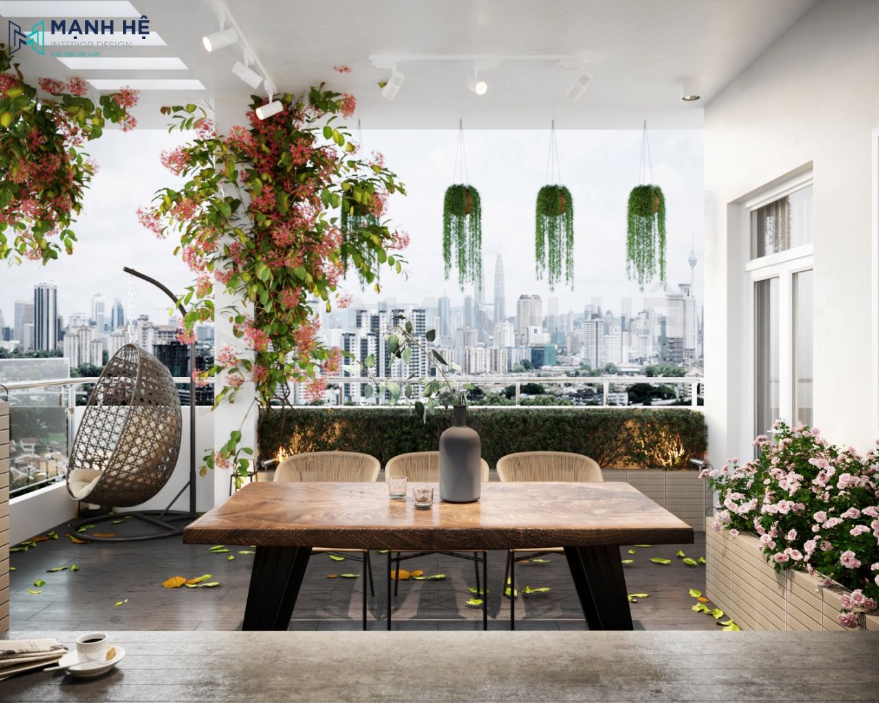 Bố trí bàn trà với view nhìn ra các tòa nhà cực chill