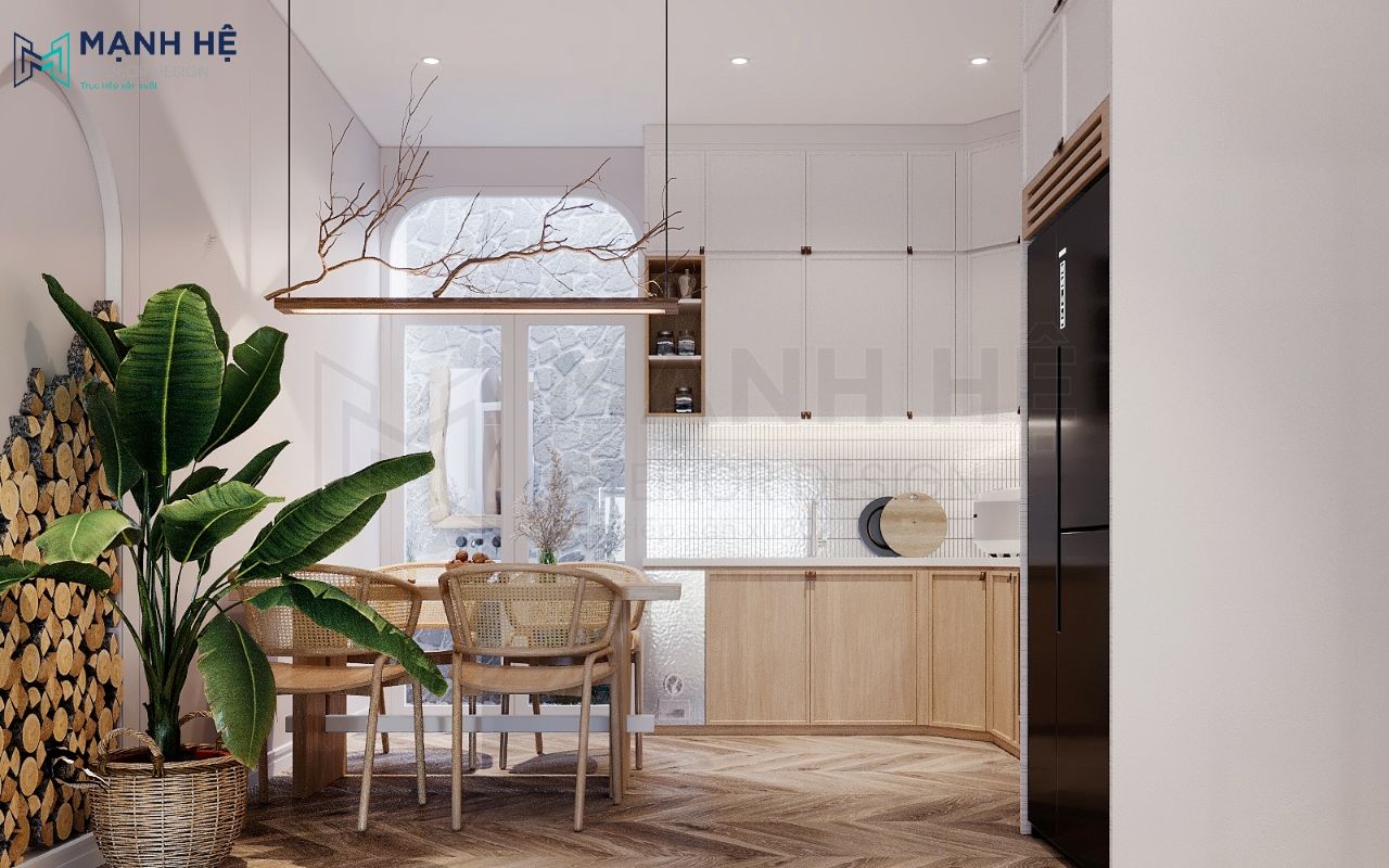 Thiết kế phòng bếp nối liền phòng khách sang trọng với hệ tủ bếp chữ L, không gian khách bếp rộng rãi, thoáng đãng với chậu cây xanh tối ưu không khí trong lành cho gia chủ.
