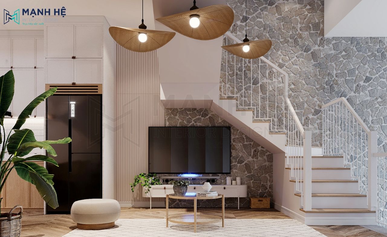 Thiết kế cầu thang lên tầng với gầm cầu thang đặt kệ tivi