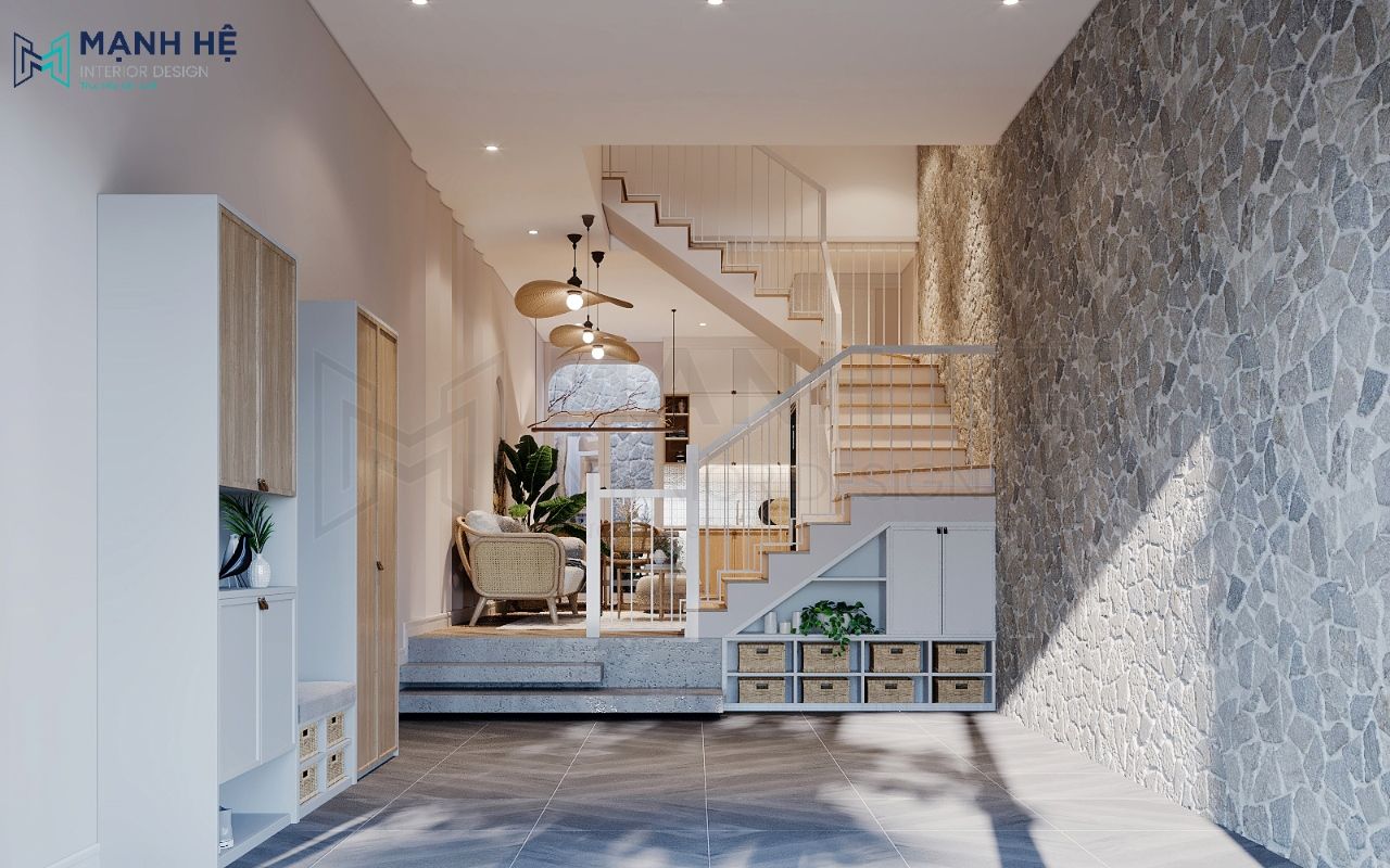 Thiết kế tủ giày kết hợp các kệ trang trí ở khoảng sân phía trước. Nhìn chung tổng thể không gian phòng khách tầng dưới đẹp hiện đại với gam màu trắng và màu be chủ đạo.