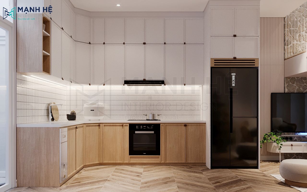 Hệ tủ bếp gỗ tự nhiên với tủ bếp trên màu trắng và tủ bếp dưới màu vàng, tích hợp các dụng cụ nấu nướng vào tủ bếp cho tiện nghi, ốp mặt bếp đá sáng bóng sạch sẽ.