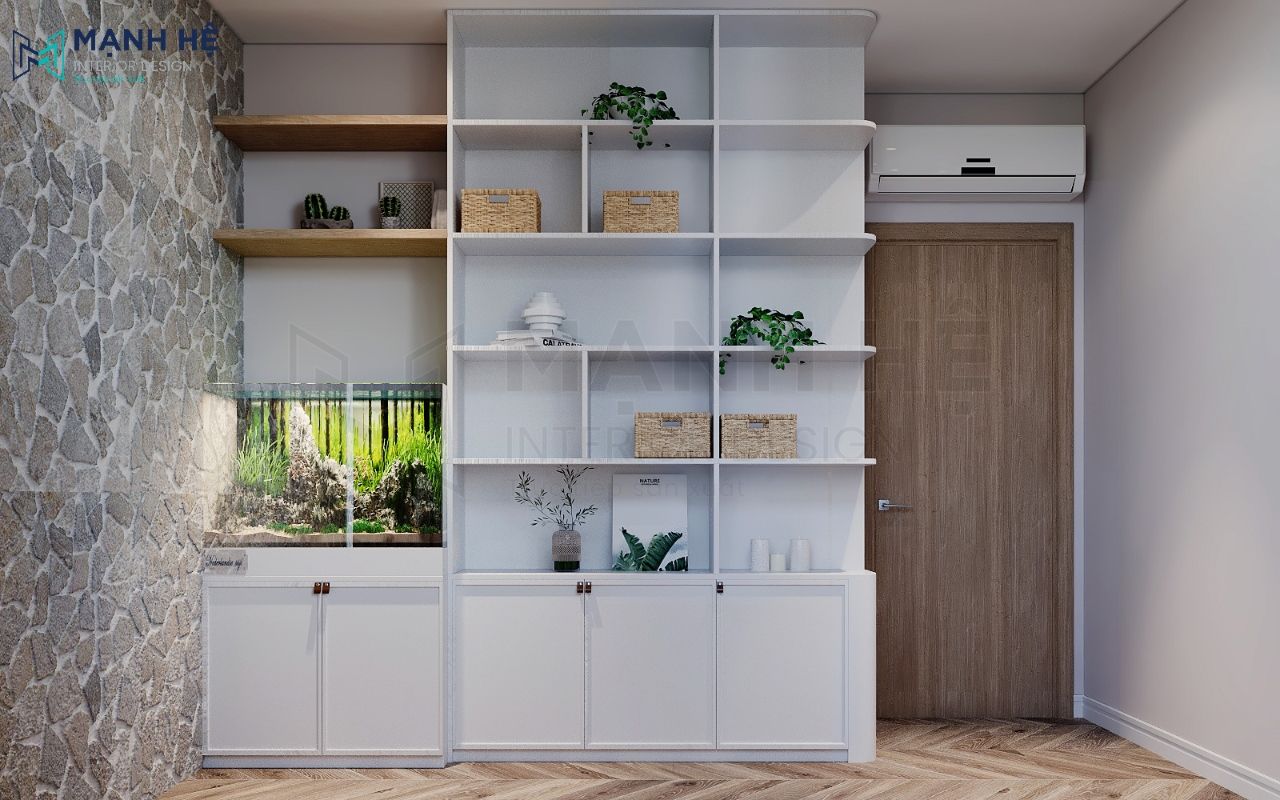 Phòng làm việc độc đáo với tủ trang trí cao đụng trần chia thành các ô để làm nơi đựng các món đồ decor theo sở thích của gia chủ.