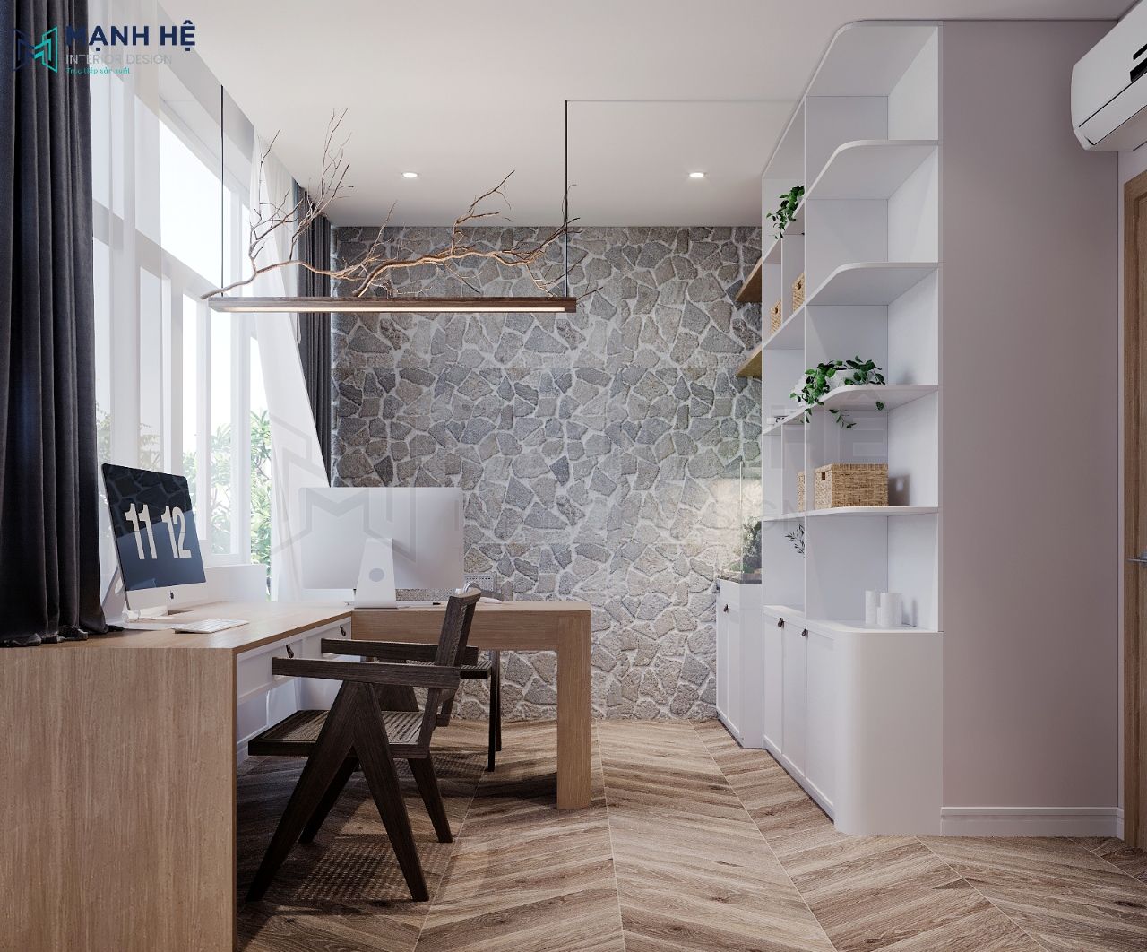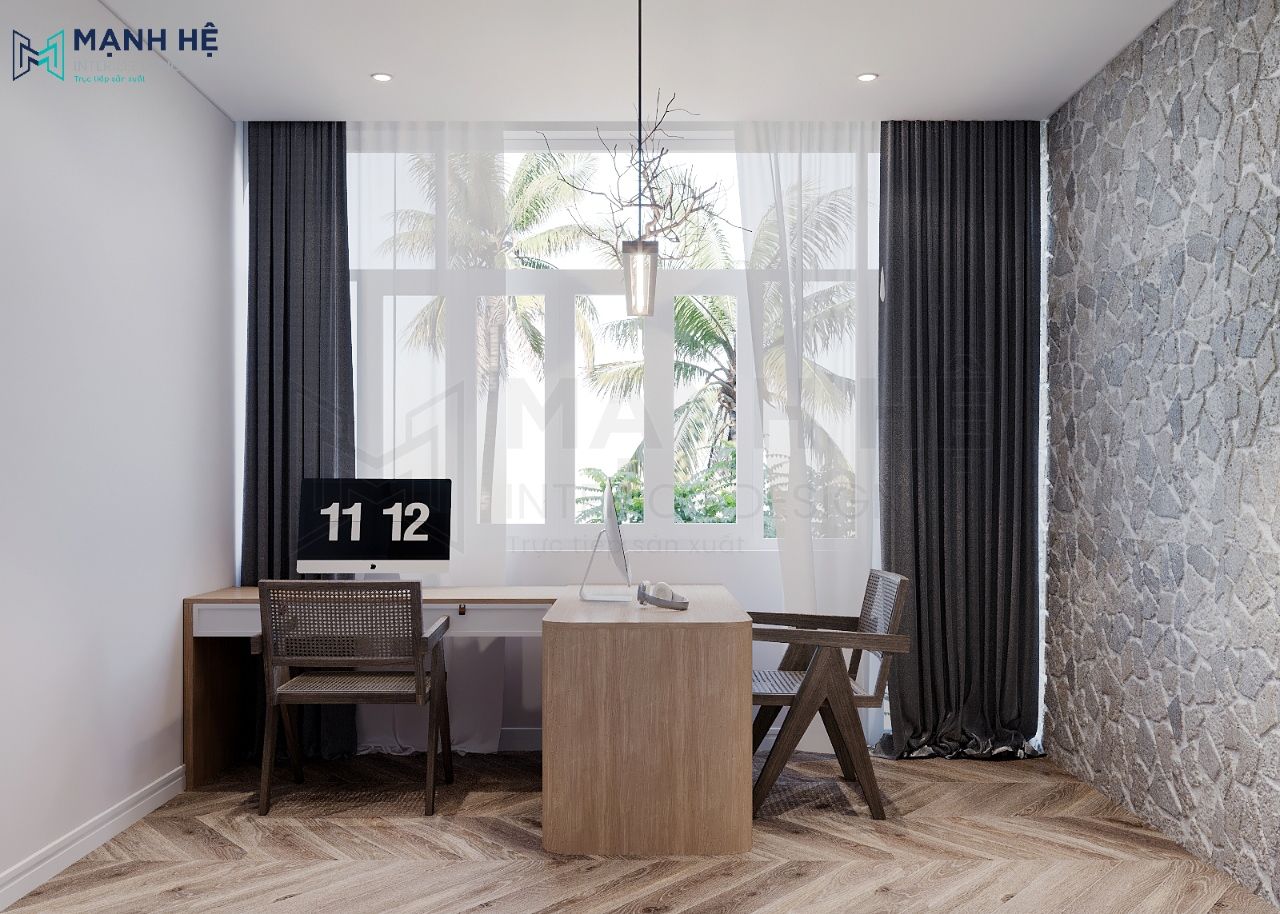 Bàn làm việc chữ L gỗ công nghiệp được thiết kế cạnh cửa sổ để gia chủ có thể thư giãn lúc mệt mỏi. Trang trí nhành cây treo trần để nhấn mạnh thêm phong cách Đông Dương mà anh Hưng hướng đến.