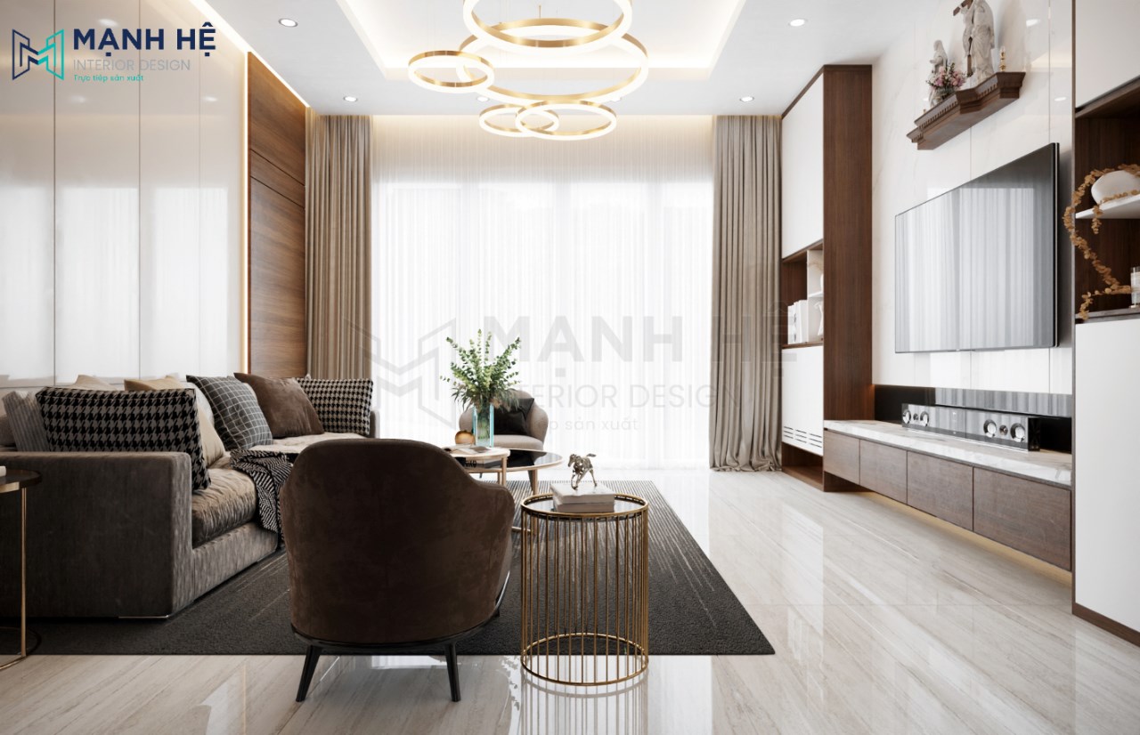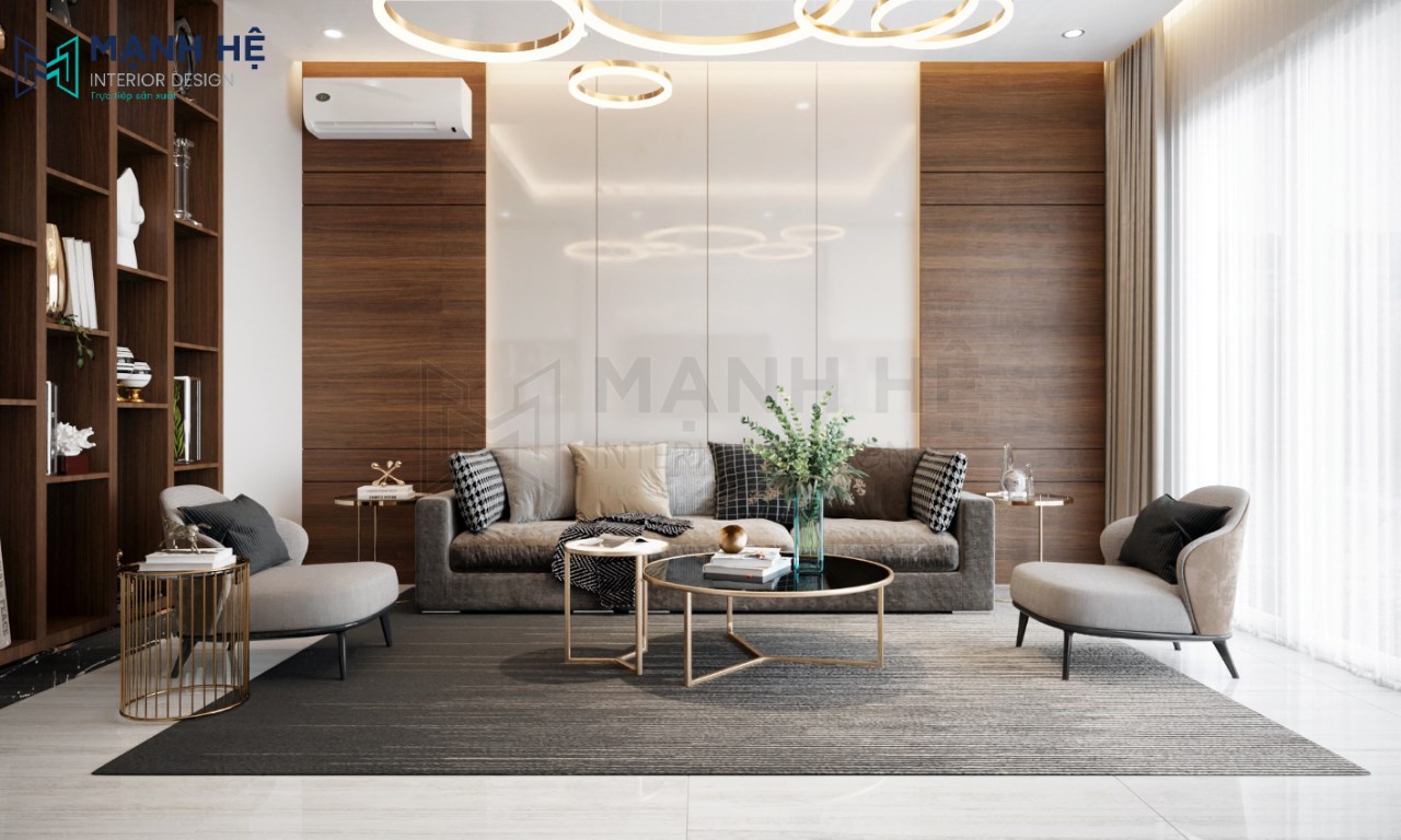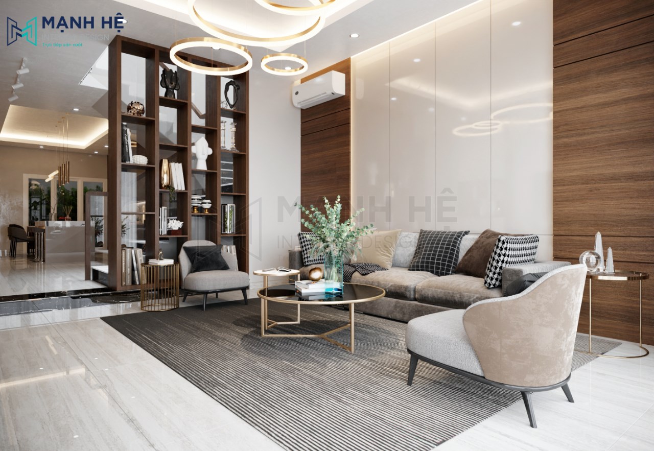 Thiết kế nội thất phòng khách hiện đại, sang trọng với màu nâu – trắng là gam màu chủ đạo. Bố trí bộ sofa màu ghi cùng bàn trà đơn giản giúp Gia chủ thuận tiện tiếp khách cũng như thư giãn, nghỉ ngơi vào mỗi tối. Vách ốp tường phía sau được làm từ gỗ cao cấp với màu trắng – nâu độc đáo. Bên cạnh đó, thảm trải sàn lớn kết hợp cùng hệ thống đèn thả trần tinh tế là điểm nhấn cho tổng thể.