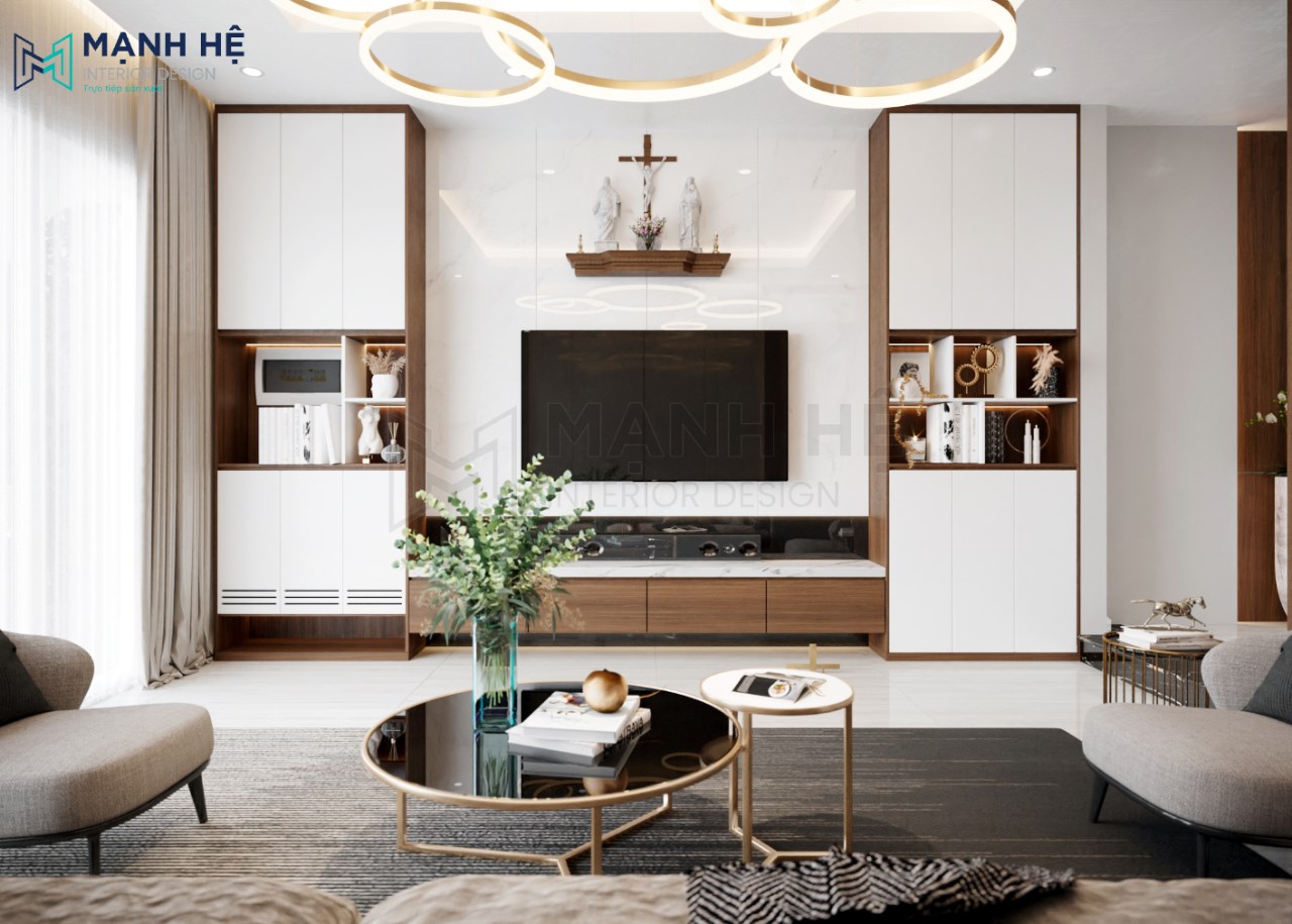 Thiết kế kệ tủ tivi đặt chính giữa 2 bên tủ trang trí đối xứng được làm từ gỗ cao cấp với màu trắng nhã nhặn, viền màu nâu gỗ độc đáo thu hút mọi ánh nhìn.