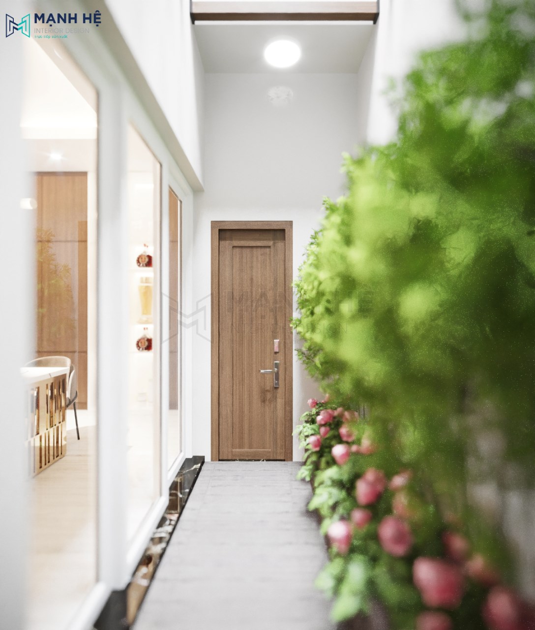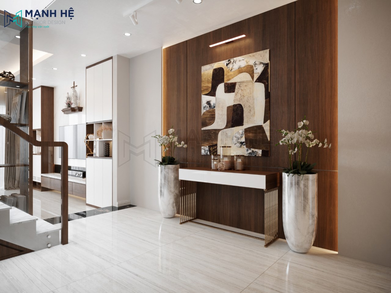 Hành lang ngăn giữa không gian phòng khách – bếp được thế một góc riêng nghệ thuật
