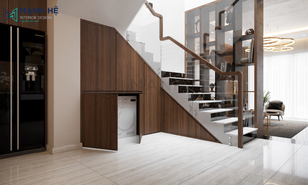 Hành lang ngăn giữa không gian phòng khách – bếp được thiết kế một góc riêng nghệ thuật mang đến vẻ đẹp độc đáo, tinh tế cho tổng thể. Bên cạnh đó, gầm cầu thang cũng được tận dụng làm tủ để máy giặt tiện nghi, tiết kiệm diện tích, mang đến không gian rộng rãi hơn.