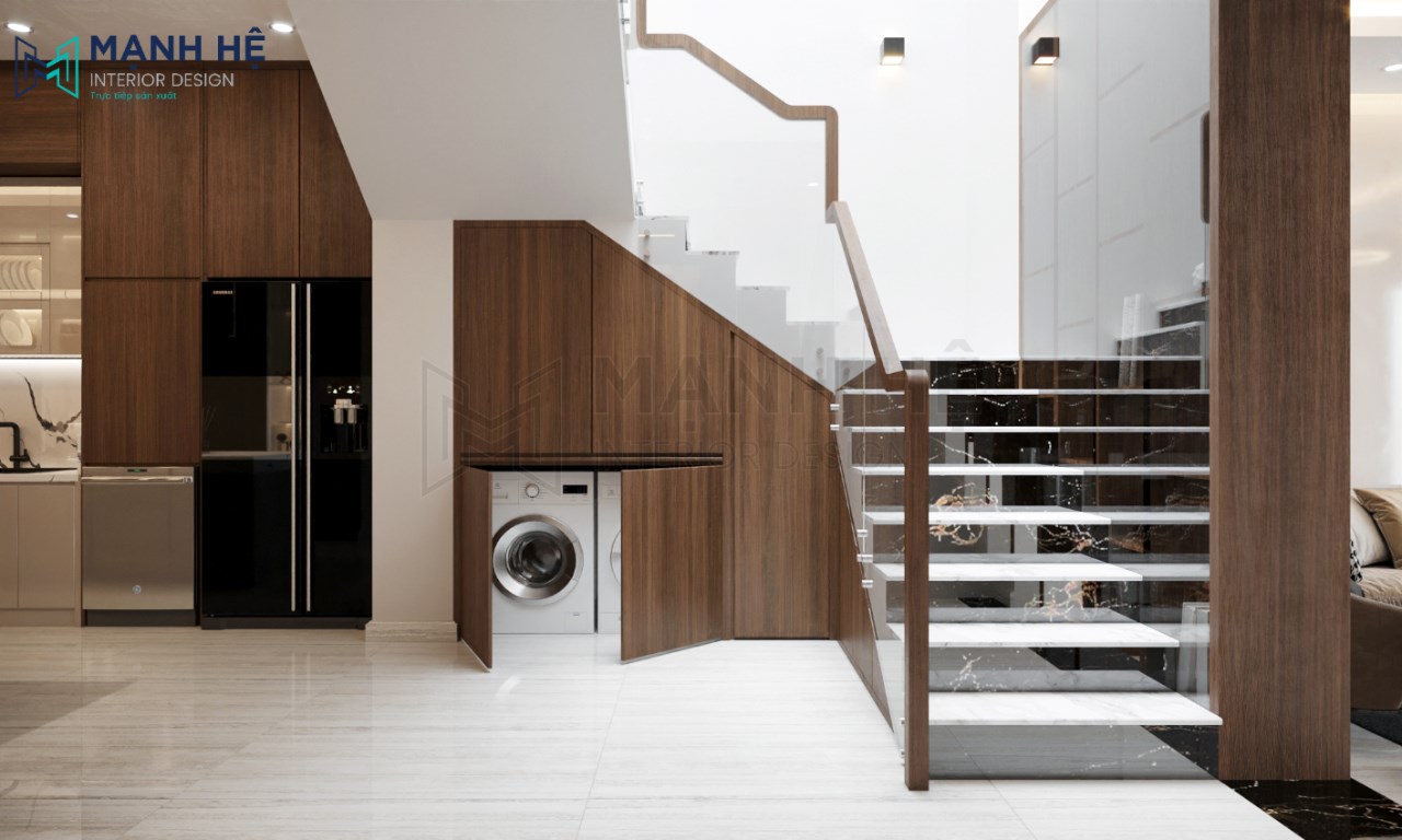 Gầm cầu thang được tận dụng làm tủ để máy giặt tiện nghi