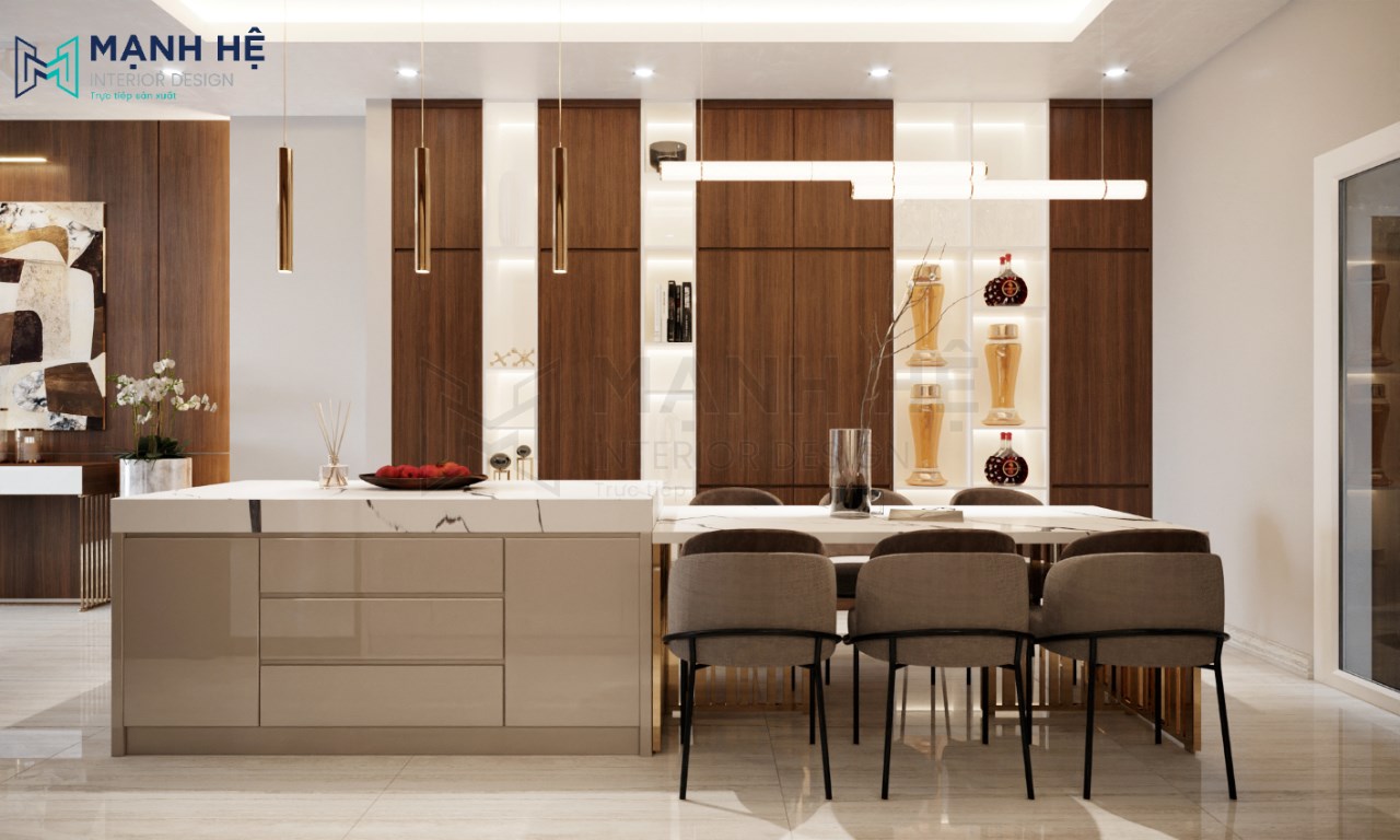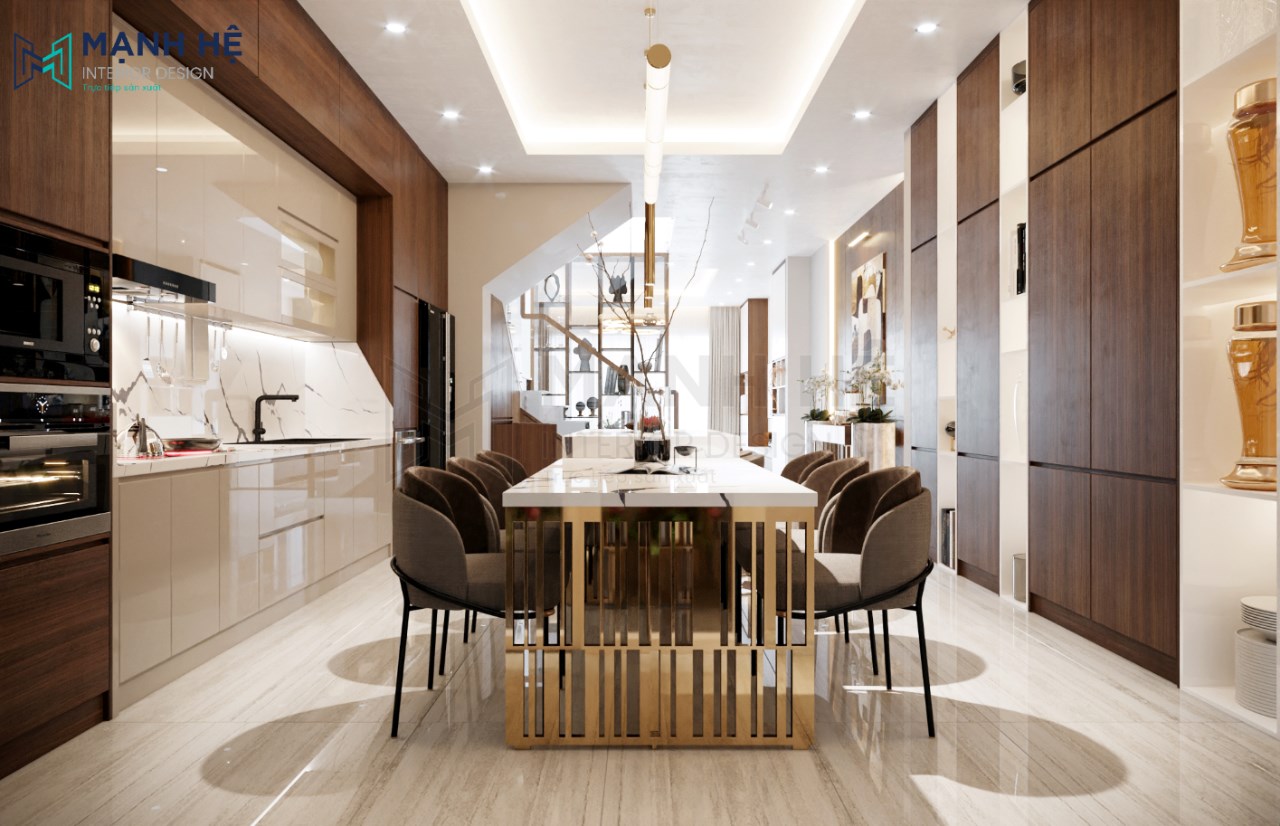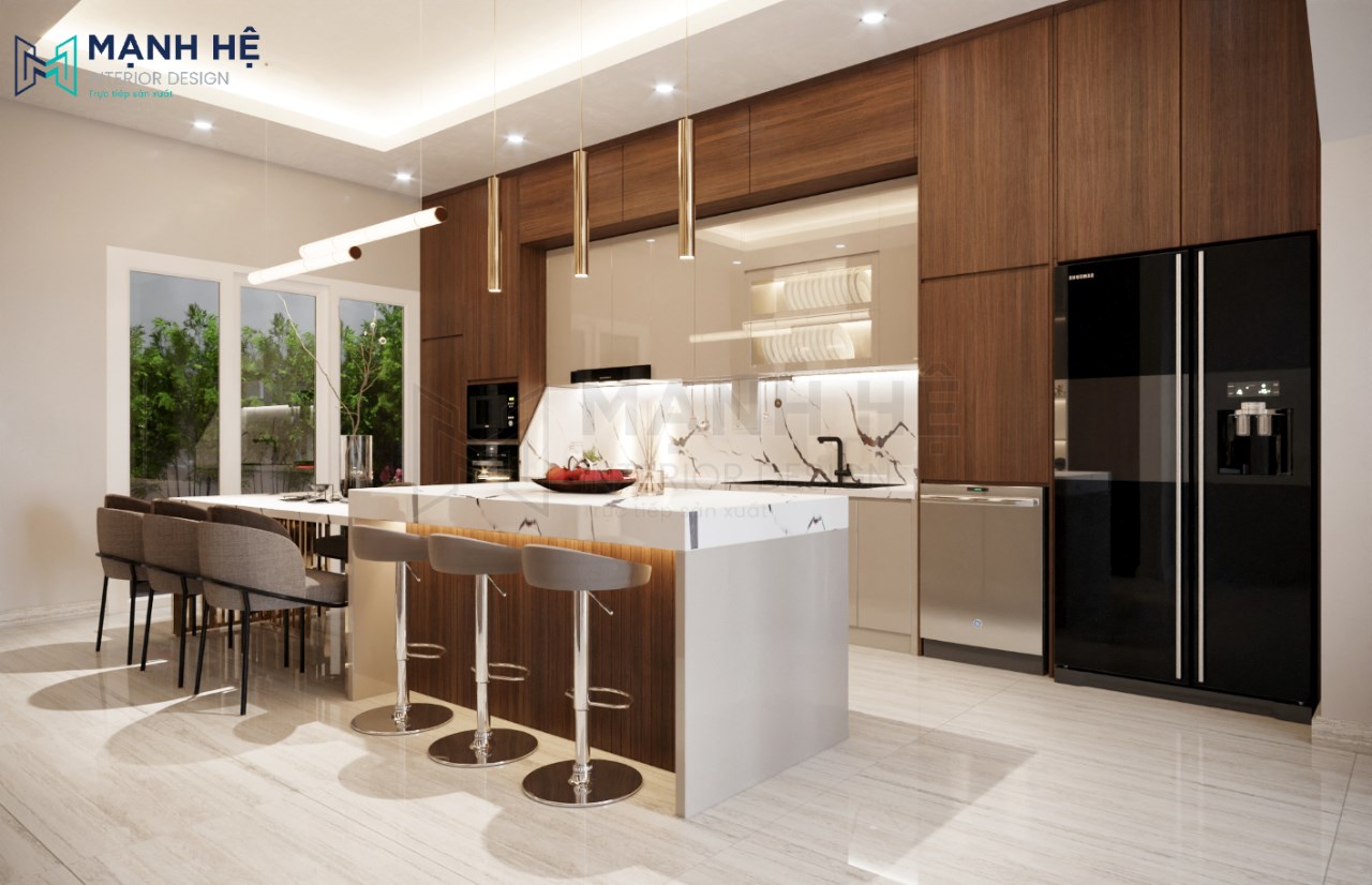 Thiết kế nội thất phòng bếp hiện đại, tiện nghi với nội thất được làm hoàn toàn từ gỗ cao cấp mang đến vẻ đẹp sang trọng, thời thượng, tạo nên không gian phòng bếp hoàn mỹ.