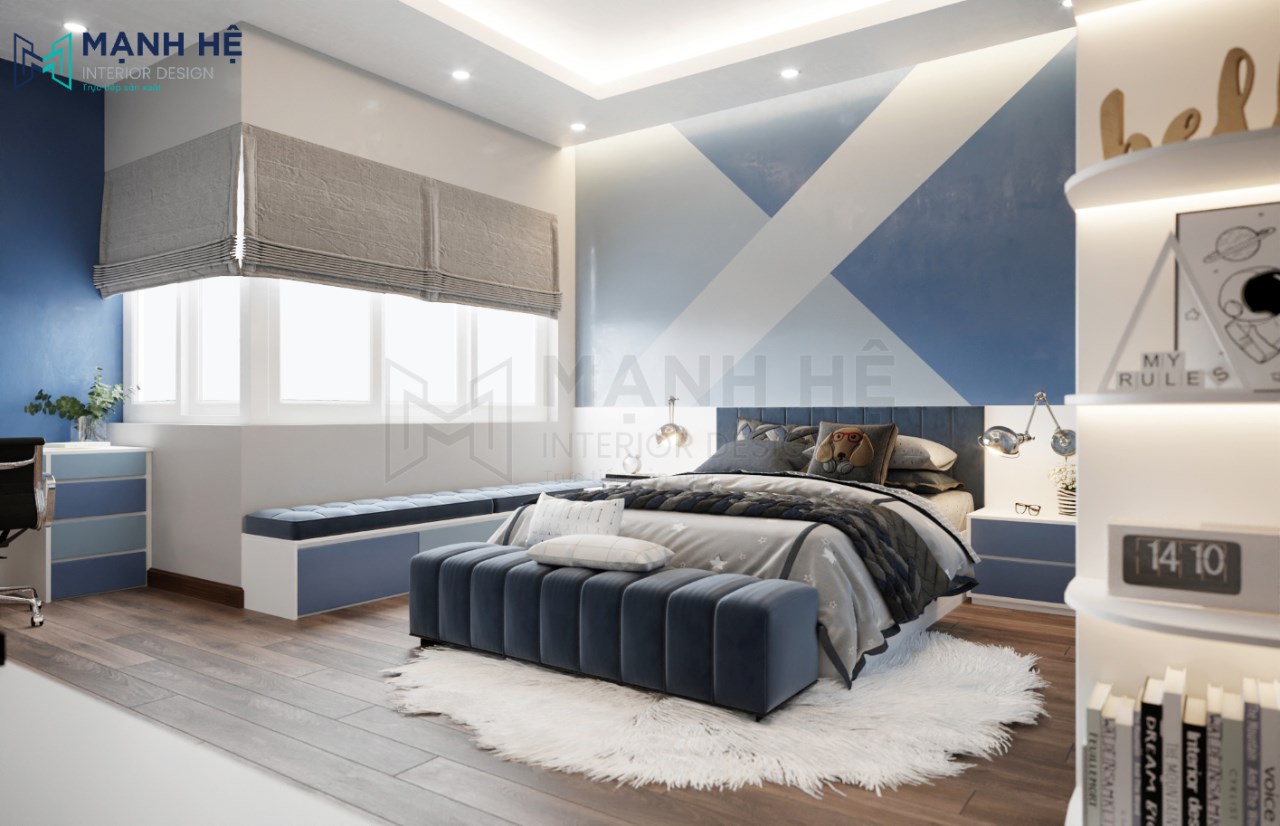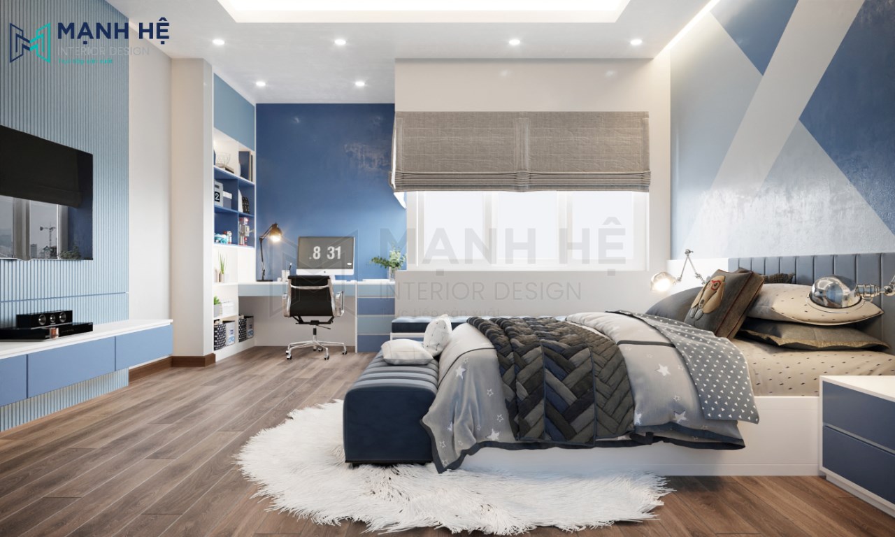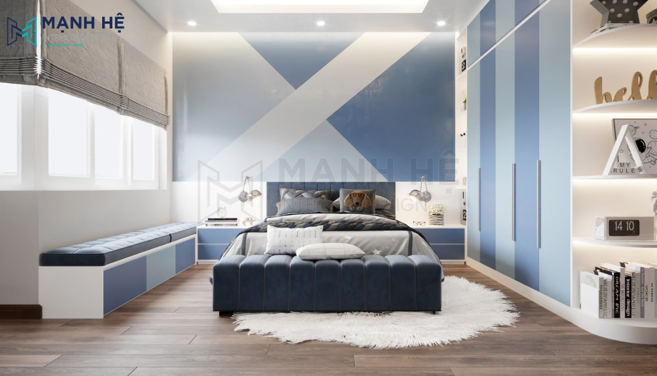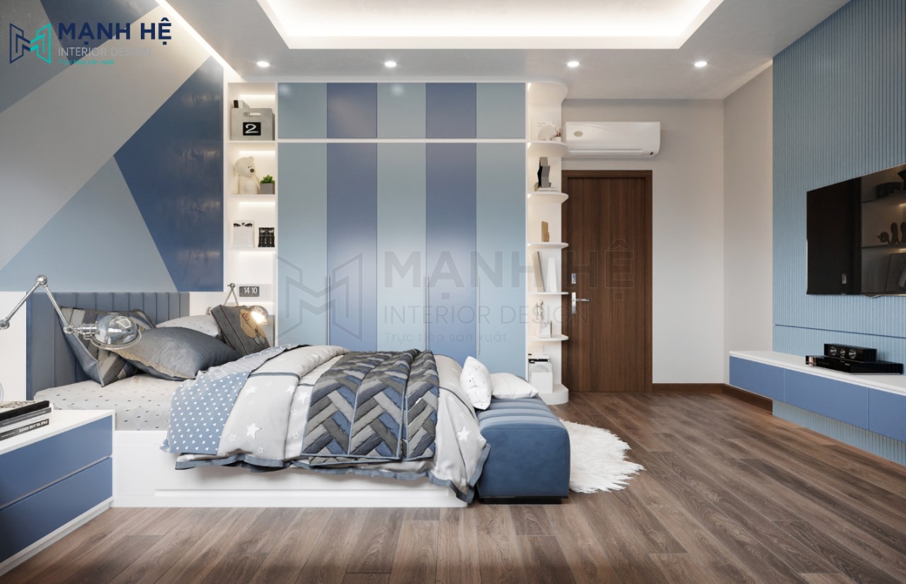 Thiết kế nội thất phòng ngủ cho bé trai tiện nghi, hiện đại với màu xanh dương là gam màu chủ đạo mang đến cảm giác sạch sẽ, mát mẻ. Bố trí giường ngủ lớn được làm từ gỗ cao cấp ở giữa, bên phải bố trí hệ tủ áo quần cao đụng trần kết hợp cùng kệ trang trí có màu xanh dương đậm nhạt xen kẽ tạo điểm nhấn độc đáo cho không gian phòng ngủ.