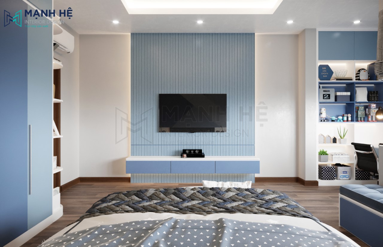 Thiết kế kệ tủ tivi đơn giản với vách ốp lam gỗ phía sau kệ tivi màu xanh dương làm điểm nhấn độc đáo, tinh tế. Thiết kế nội thất phòng ngủ đúng với sở thích của bé sẽ mang đến cho bé giấc ngủ trọn vẹn hơn.