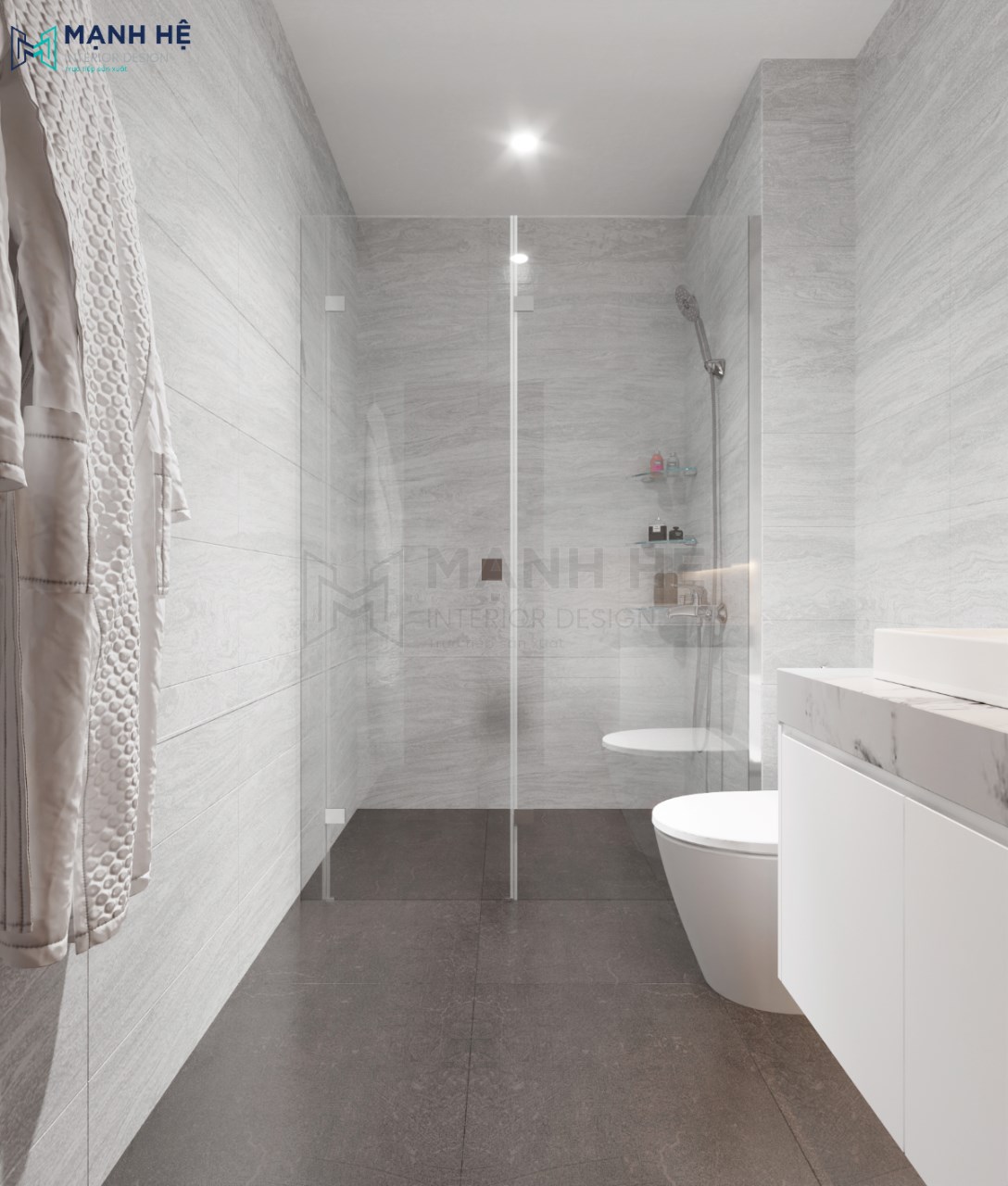 Phòng tắm được ốp gạch toàn bộ đem đến không gian sạch sẽ