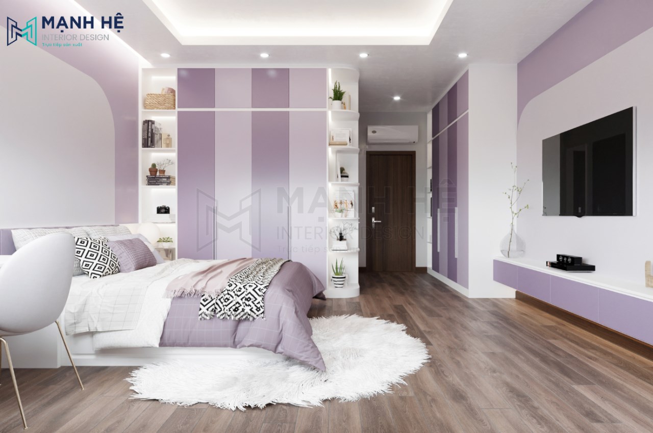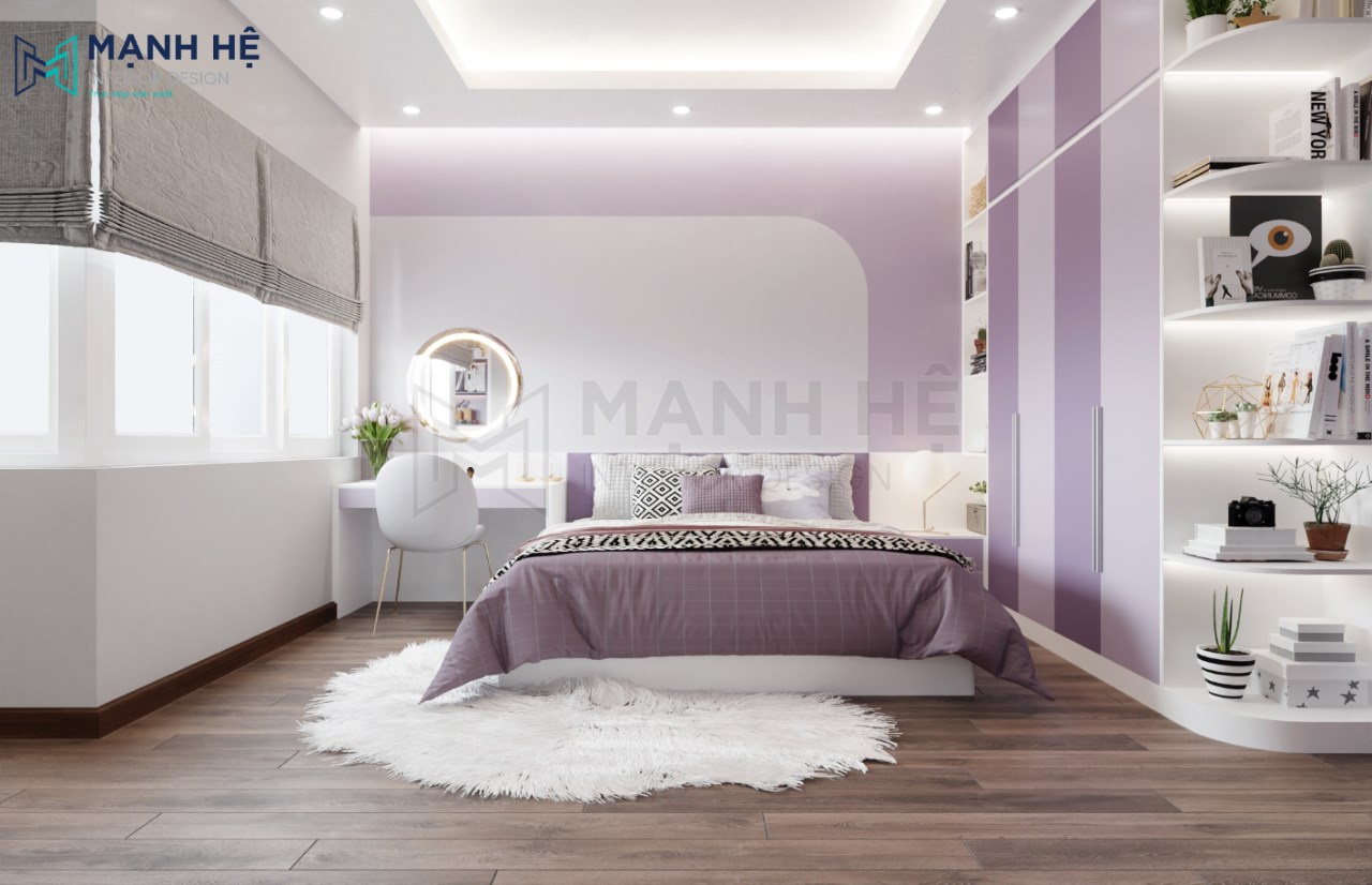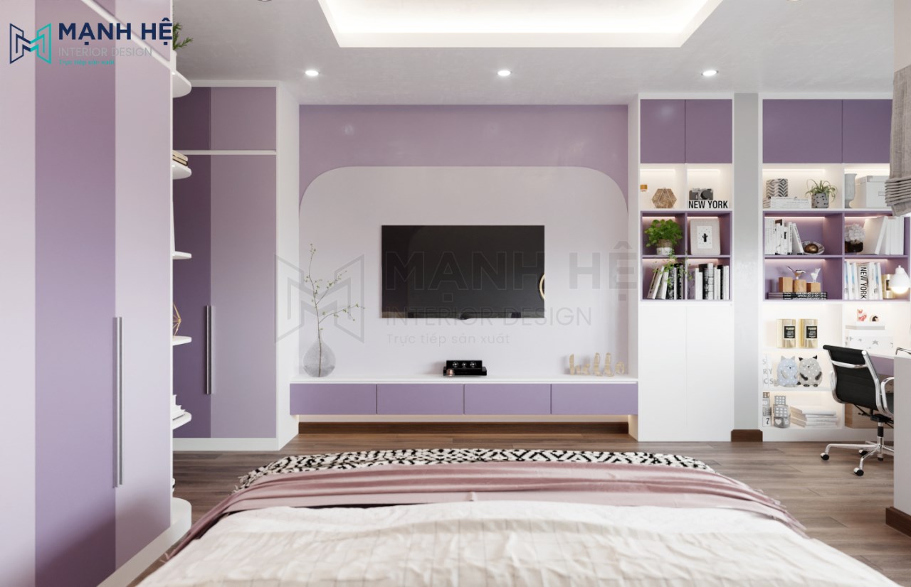 Thiết kế nội thất phòng ngủ cho bé gái với màu tím nhẹ nhàng là gam màu chủ đạo. Bố trí giường ngủ lớn được làm từ gỗ cao cấp ở giữa, bên phải là hệ tủ áo quần cao đụng trần kết hợp cùng kệ trang trí có màu tím đậm nhạt xen kẻ tạo nên điểm nhấn nổi bật cho không gian phòng ngủ.