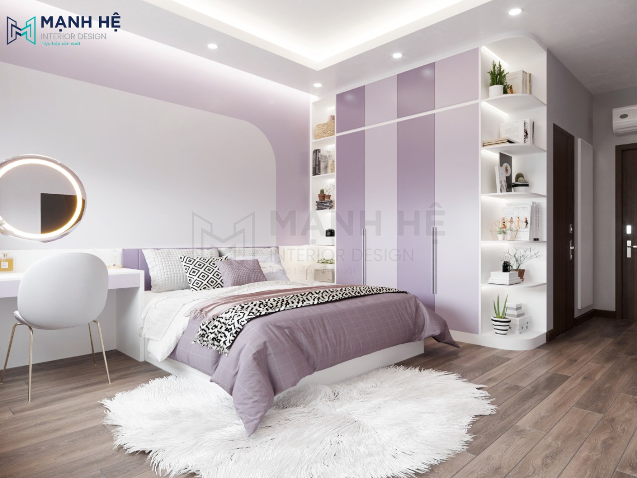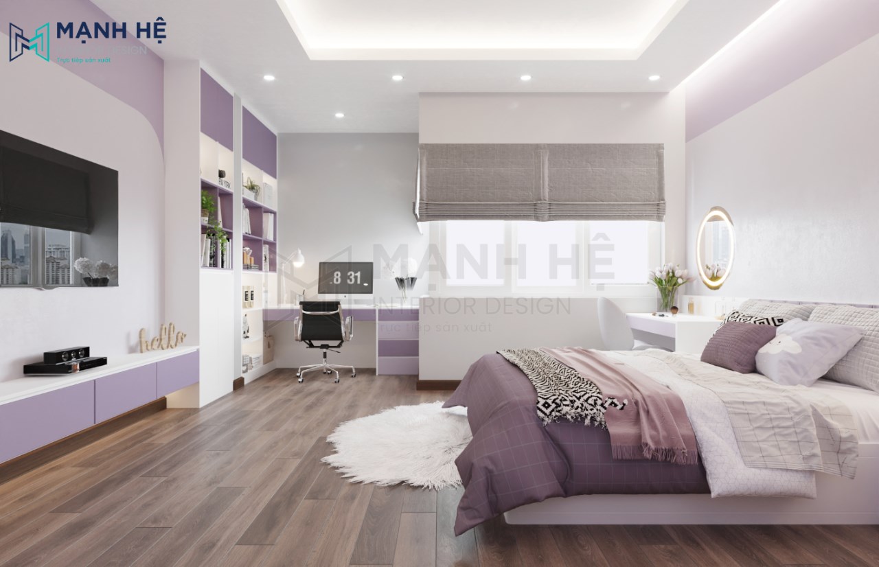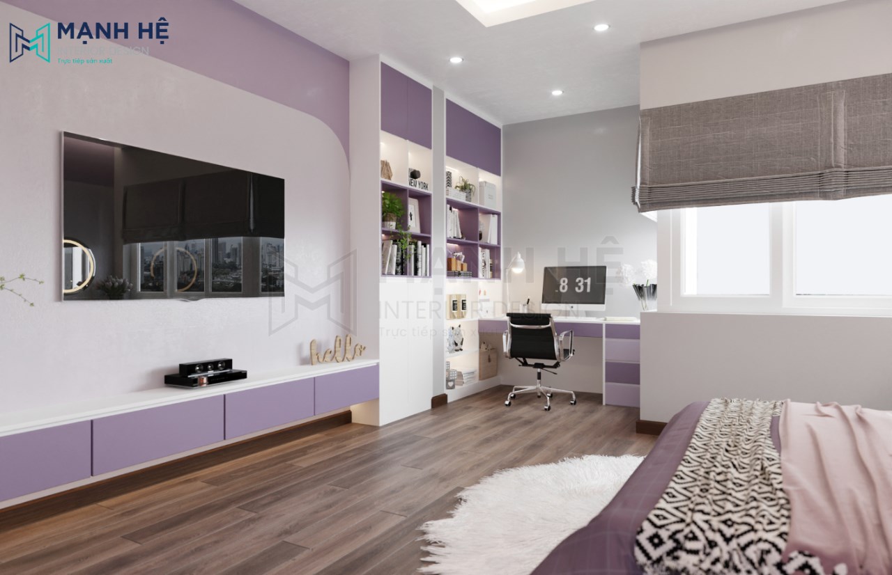 Thiết kế nội thất phòng ngủ cho bé gái với màu tím nhẹ nhàng là gam màu chủ đạo. Bố trí giường ngủ lớn được làm từ gỗ cao cấp ở giữa, bên phải là hệ tủ áo quần cao đụng trần kết hợp cùng kệ trang trí có màu tím đậm nhạt xen kẻ tạo nên điểm nhấn nổi bật cho không gian phòng ngủ.