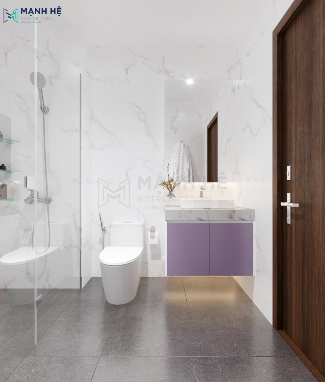 Nhà vệ sinh trong phòng ngủ với tủ đựng đồ gam màu tím đồng bộ