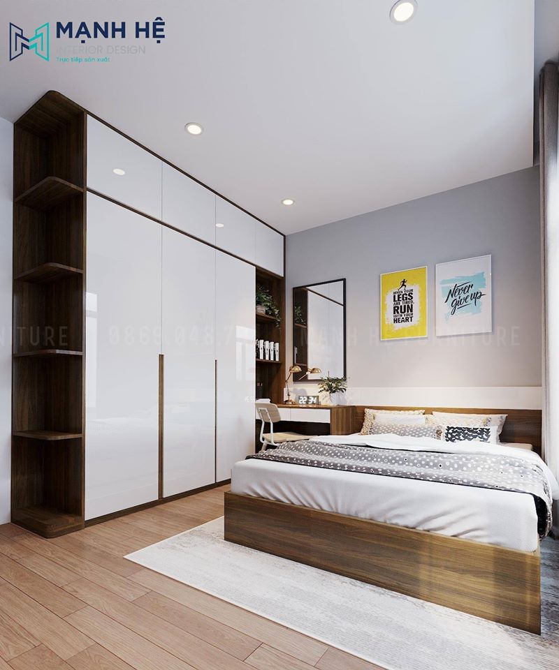 Vì đây là phòng ngủ chính nên được chị Trân đầu tư rất kỹ càng, căn phòng ngủ ấm cúng với các đồ nội thất được làm từ gỗ công nghiệp. Giường ngủ với vách ốp phẳng lỳ, tab đầu giường dạng dài, phía sau sử dụng giấy dán tường giả chất liệu sần sùi. Trang trí thêm vài đường ron vàng bắt mắt và bức hình nghệ thuật xanh – vàng.