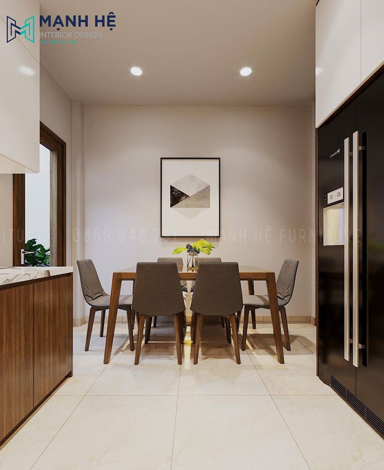 Phòng ăn đơn giản được bố trí bộ bàn ghế ăn 6 người, bức tranh phong thư giúp không gian thêm phần sinh động và làm điểm nhấn cho bàn ăn.