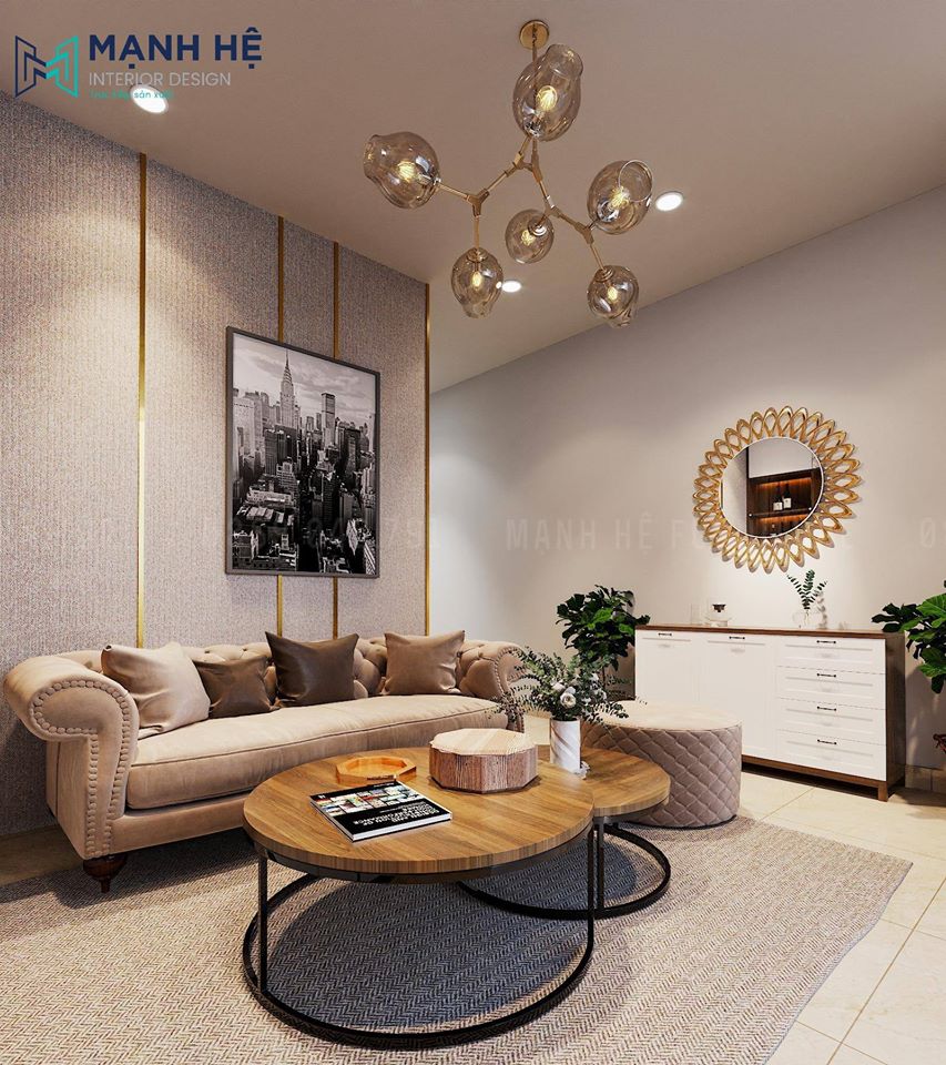 Sử dụng giấy dán tường Hàn Quốc họa tiết giả nhám, trang trí bằng những đường ron vàng bắt mắt. Thảm trải sàn hình xương cá được đặt dưới bộ ghế sofa làm cho căn phòng thêm nổi bật. Đèn thả chao thủy tinh 6 bóng treo phòng khách hiện đại.
