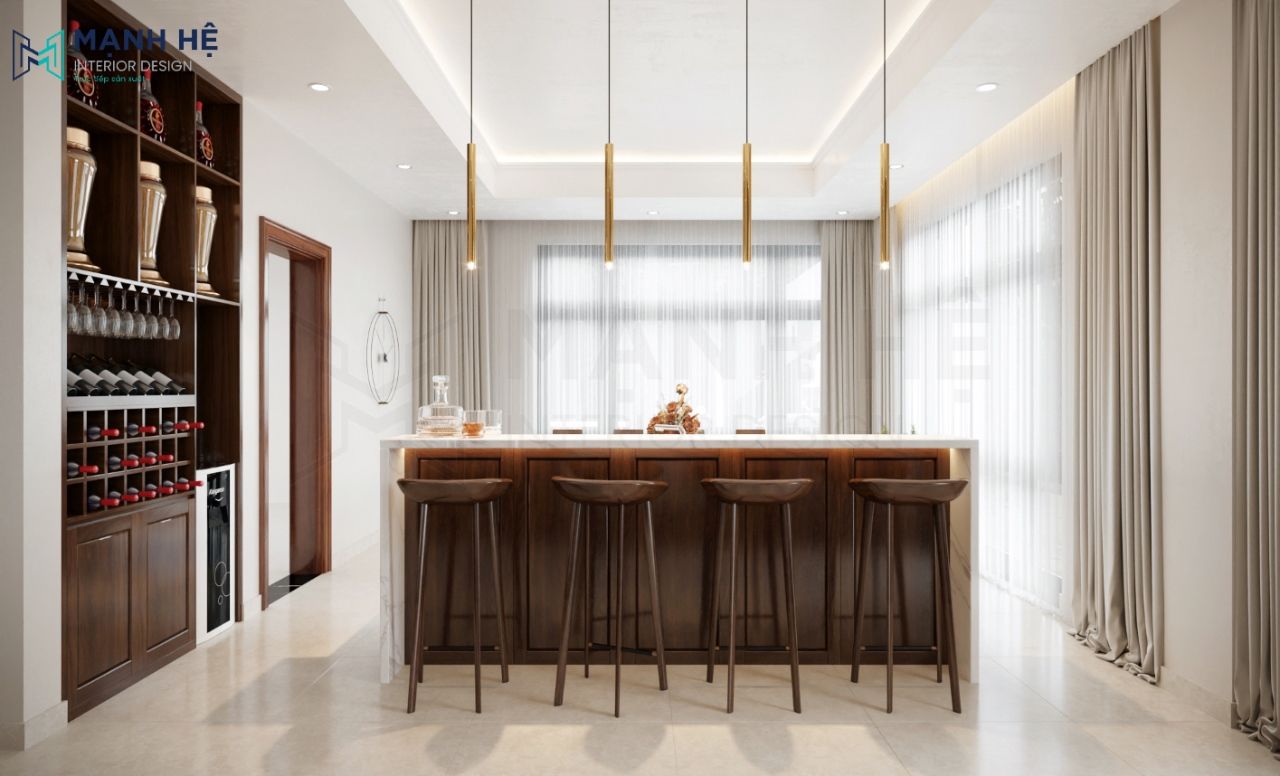 Điểm nhấn phòng bếp với thiết kế đảo bếp kết hợp quầy bar với hệ thống đèn trần thả ấn tượng. Bề mặt quầy bar ốp đá trắng vân mây tự nhiên, màu nâu được chọn làm gam màu chủ đạo cho toàn bộ nội thất phòng bếp.