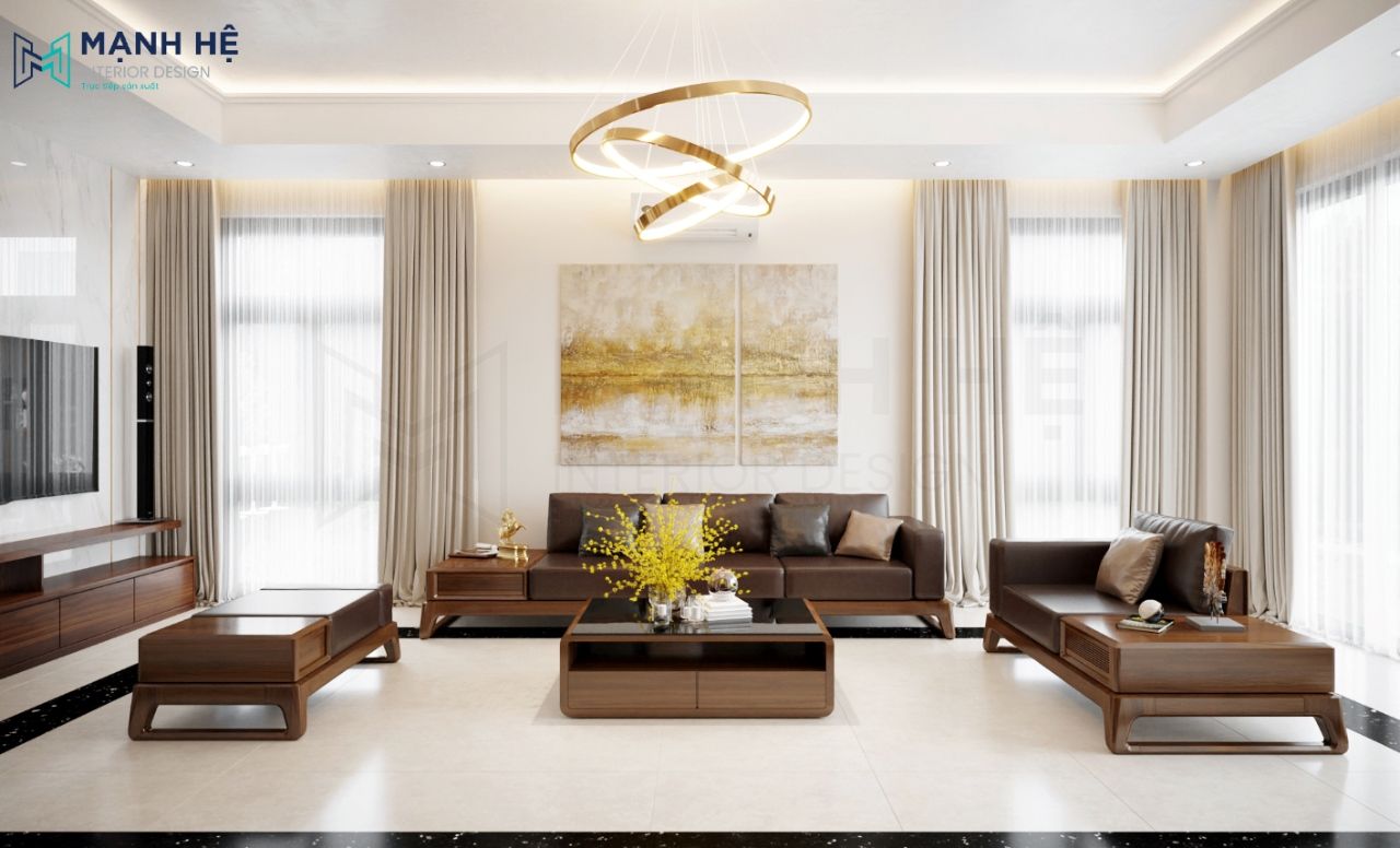 Thiết kế nội thất phòng khách nhà phố phong cách hiện đại từ gỗ sồi tự nhiên đem lại không gian thư giãn, tiếp khách thoải mái, tự nhiên cho gia chủ. Bố trí ghế sofa và bàn trà theo hình chữ U bắt mắt màu nâu trầm ấm.