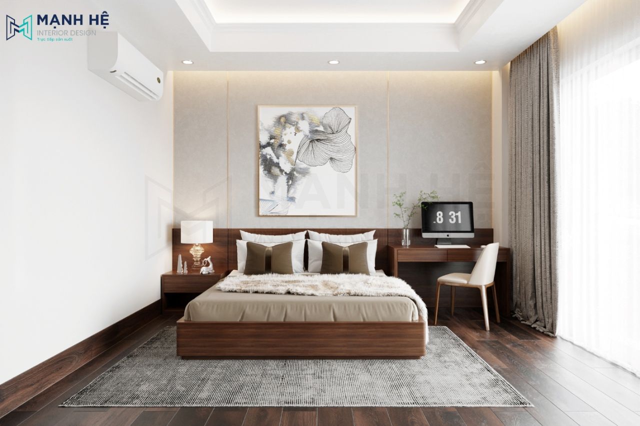 Bố trí giường ngủ ở giữa phòng với thảm lông lót sàn tinh tế. Kệ tivi gỗ màu nâu trầm ấm đồng bộ màu với toàn bộ nội thất căn nhà. Tối ưu ánh sáng phòng ngủ nhờ thiết kế rèm 2 lớp và hệ thống đèn led.
