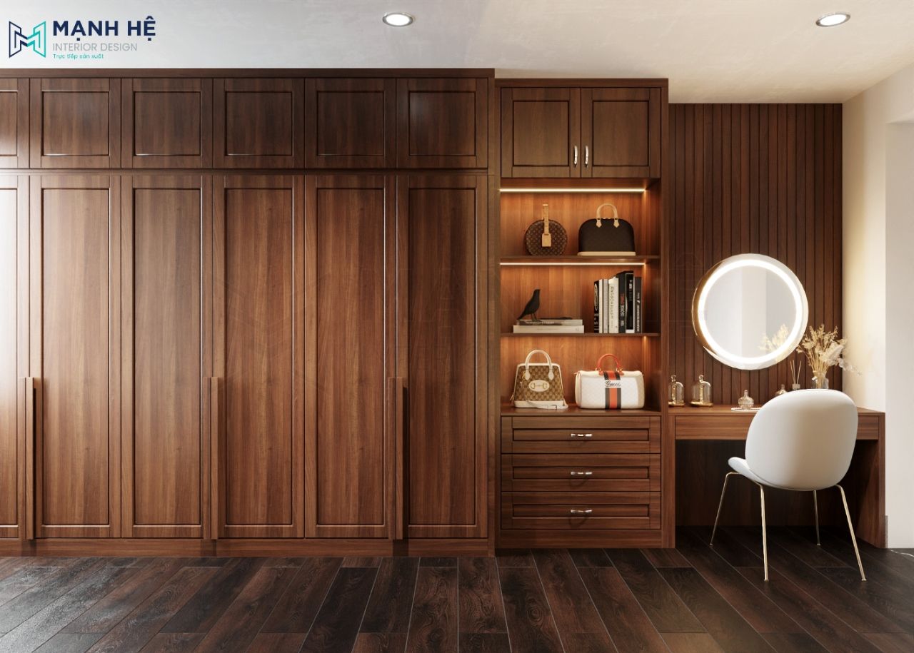 Thiết kế thêm không gian thay đồ được tích hợp trong phòng ngủ này. Với tủ quần áo gỗ tự nhiên cánh mở 4 buồng màu nâu sang trọng. Tích hợp thêm tủ đựng mỹ phẩm và bàn trang điểm. Điểm nhấn bàn trang điểm với gương tròn gắn led sáng rực.