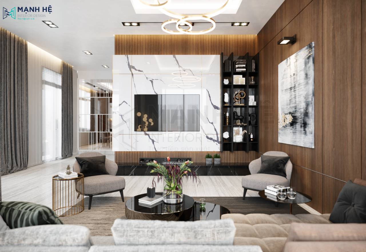 Nội thất phòng khách với thiết kế tối giản nhưng điểm nhấn nằm ở vách lam gỗ ốp tường rất sang trọng. Ốp tường đá vân mây tự nhiên kết hợp đường ron vàng rực rỡ sau tivi. Đèn trần thả thiết kế bắt mắt kết hợp đèn led âm trần giúp phòng khách thêm sáng sủa.