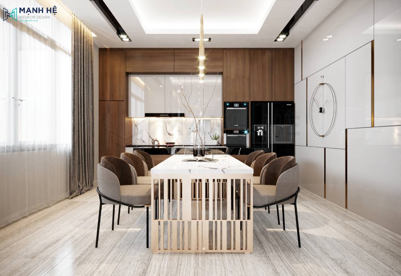 Tích hợp thêm các thiết bị, dụng cụ nấu ăn vào hệ tủ bếp cho tiện nghi, bàn ăn rộng lớn giúp gia chủ thuận tiện trong việc chiêu đãi khách hoặc ăn uống hội họp gia đình cho thoải mái.