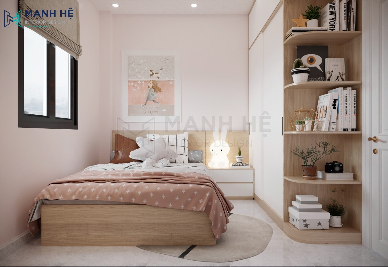 Thiết kế nội thất phòng ngủ cho bé gái với màu hồng ngọt ngào là gam màu chủ đạo. Bố trí giường ngủ sát tường giúp tiết kiệm diện tích. Bên cạnh đó, giường ngủ có thêm hộc kéo ở dưới cho bé tăng thêm không gian để đồ.