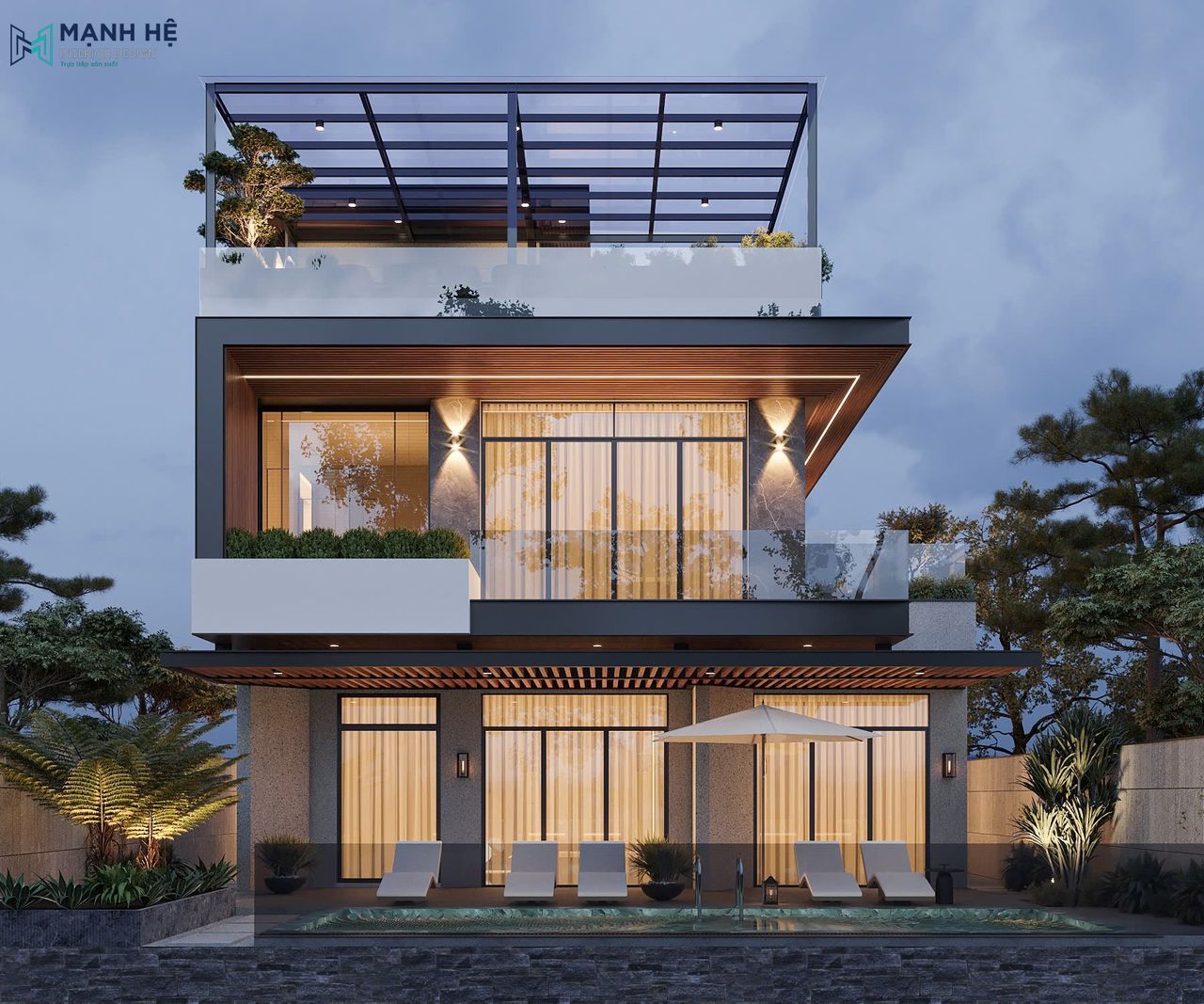 Ngay từ ánh nhìn đầu tiên, kiến trúc công trình gây ấn tượng bởi hình khối mạnh mẽ, đường nét vuông vức, hài hòa cùng chất liệu kính, đá và gỗ vừa phô diễn sự sang trọng, vừa giữ được sự ấm áp cần có của một tổ ấm. Không gian được tổ chức theo chiều đứng, mỗi tầng là một lớp trải nghiệm riêng, từ khu vực hồ bơi thư giãn ở tầng trệt, khu sinh hoạt chung bán mở tầng 2 đến sân thượng xanh mát với khu bếp nướng ngoài trời. Tất cả tạo nên một tổ ấm hiện đại như resort thu nhỏ giữa lòng Hà Nội.