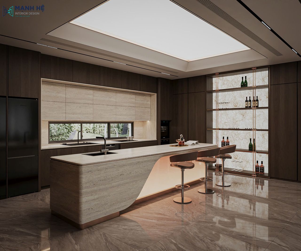 Đội ngũ Mạnh Hệ đã tạo nên một phòng bếp hiện đại kết hợp đảo bếp trung tâm vừa mang tính kết nối vừa tăng tính thẩm mỹ cho không gian. Đảo bếp ốp đá vân sáng là điểm nhấn chính, với thiết kế bo cong mềm mại và hệ đèn hắt ánh cam đồng bên dưới, tạo cảm giác ấm cúng, vô cùng tinh tế cho phòng bếp.