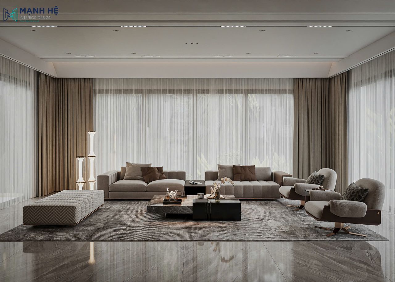 Phòng khách được xem là nơi thể hiện rõ nhất gu thẩm mỹ và phong cách sống của gia chủ – “mặt tiền chính” của toàn bộ không gian, nơi để lại ấn tượng đầu tiên và cũng là niềm tự hào của mỗi ngôi nhà. Qua đó, đội ngũ Mạnh Hệ đã khéo léo kết hợp vật liệu cao cấp như đá tự nhiên vân mây, gỗ veneer nâu trầm và chi tiết ánh kim tinh tế, tạo nên tổng thể thanh lịch nhưng vẫn toát lên sự bề thế.