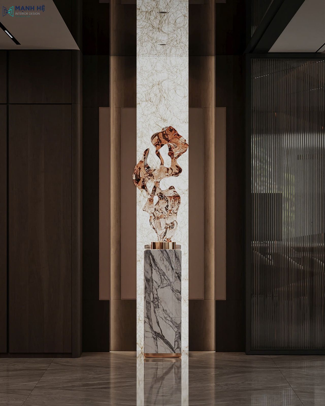 Đội ngũ thiết kế đã chọn lọc những vật liệu cao cấp nhất – từ đá tự nhiên, veneer nâu trầm đến ánh kim tinh tế – tạo nên không gian sang trọng, thanh lịch và góp phần khắc họa phong cách hiện đại và đẳng cấp cho toàn bộ dự án.