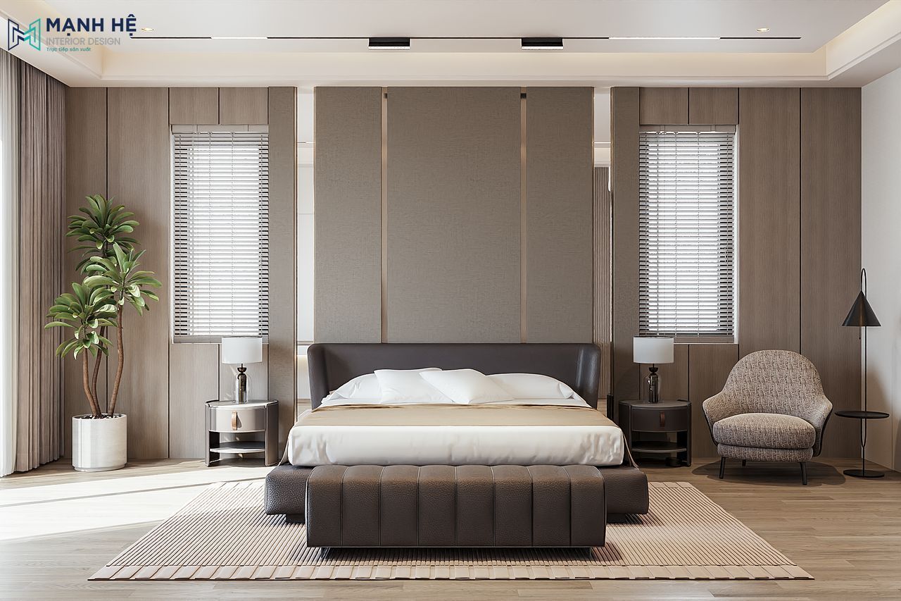 Phòng ngủ master được thiết kế hiện đại nhấn mạnh vào tỷ lệ, chất liệu và ánh sáng để đảm bảo giữa công năng và thẩm mỹ. Vách tường được ốp nỉ kết hợp chạy ron kim loại ánh đồng, tạo điểm sáng nhẹ nhàng cho phòng ngủ. Cách sắp xếp bố cục phòng ngủ master với tỷ lệ vô cùng cân đối, với 2 bên giường ngủ được đối xứng bởi 2 cửa sổ đơn và tối ưu ánh sáng bằng rèm sáo nhôm hiện đại.