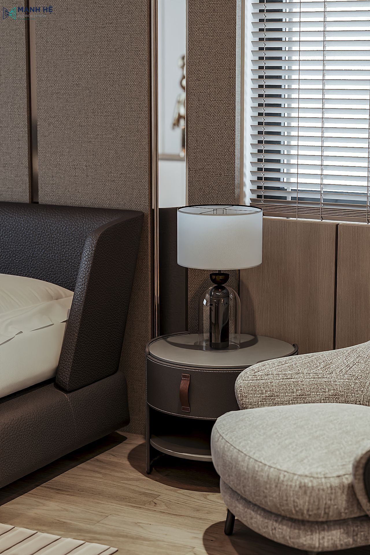 Ưu tiên sự nghỉ dưỡng, tuy nhiên Mạnh Hệ vẫn bố trí thêm khu vực làm việc nhỏ gọn, để đáp ứng hoàn toàn công năng của một phòng ngủ master.