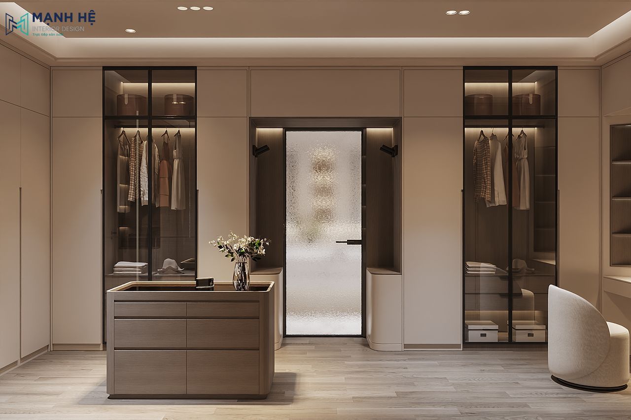 Để ngăn tách riêng biệt khu vực nghỉ ngơi và nơi thay đồ, đội ngũ đã thiết kế phòng thay đồ riêng liền kề. Với đa dạng cách thiết kế hệ tủ lưu trữ để phù hợp với từng công năng sử dụng, từ hệ tủ cánh kính đến tủ cánh gương kịch trần và đảo tủ ở trung tâm. Một chi tiết thể hiện dụng ý của đội ngũ thiết kế trong việc tối ưu không gian lưu trữ riêng tư mà vẫn giữ được sự tinh tế, gọn gàng. Bên cạnh đó, Mạnh Hệ còn tích hợp bàn trang điểm tại khu vực này, để tạo sự thuận lợi cho sinh hoạt hằng ngày của gia chủ.