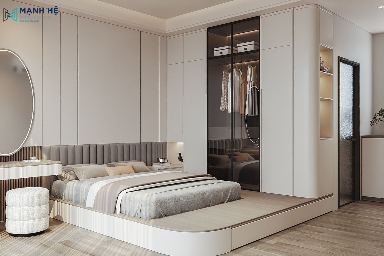 Điểm nhấn nổi bật của không gian nằm ở hệ tủ quần áo cánh kính giúp tôn lên vẻ đẹp của đồ nội thất bên trong, được hỗ trợ bởi đèn LED hắt nhẹ. Tủ được tích hợp kệ trưng bày mở, tạo thêm điểm nhấn nhỏ cho không gian. Góc tủ bo cong tinh tế vừa tăng tính thẩm mỹ, vừa tạo liên kết liền mạch với mảng tường dẫn vào nhà vệ sinh, giúp không gian thống nhất và có chiều sâu hơn.