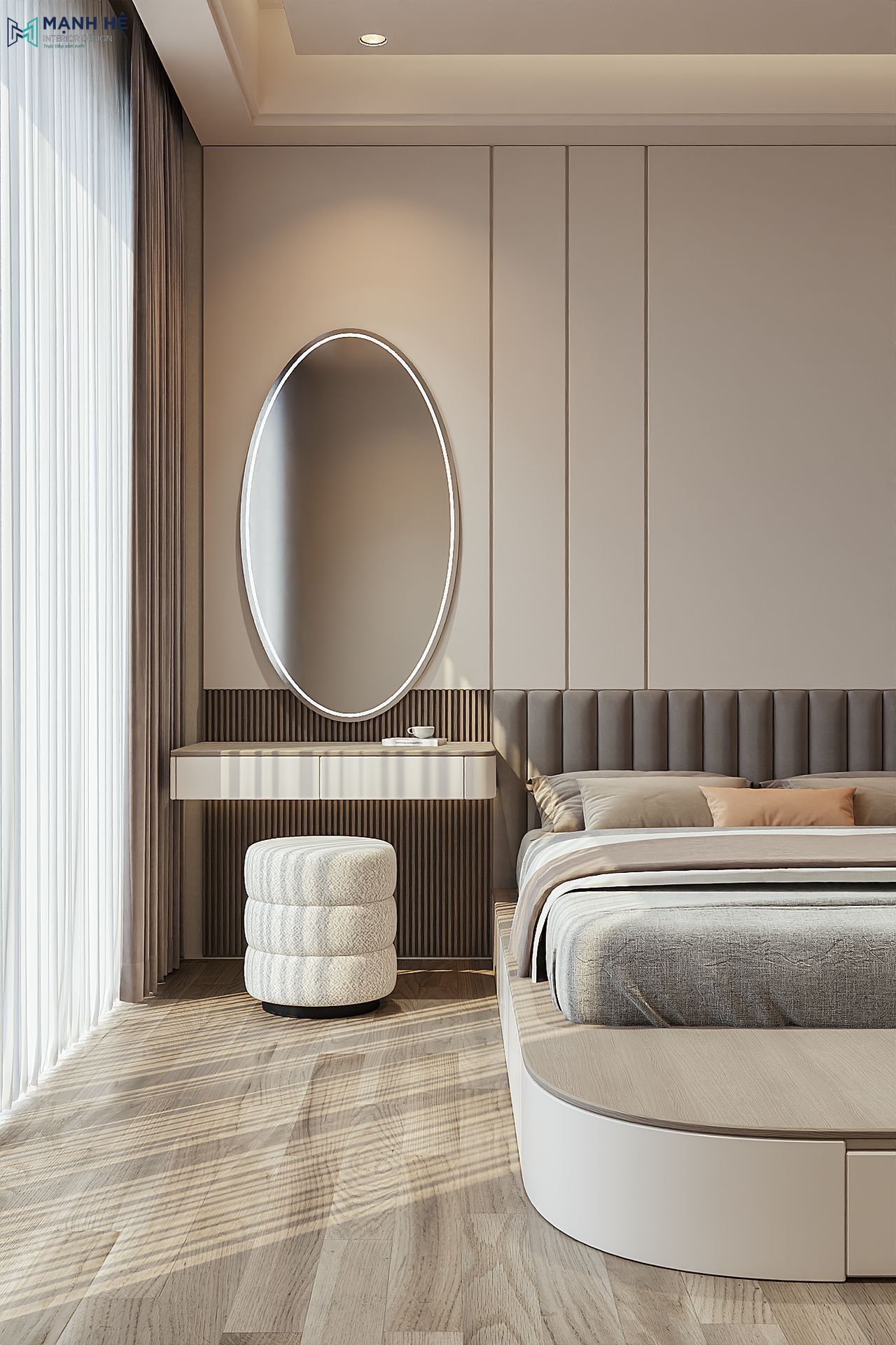 Bên cạnh đó, hệ tủ quần áo kịch trần được thiết kế liền khối với kệ trang trí hở có đèn hắt âm, tạo chiều sâu thị giác và nhấn mạnh nét sang trọng. Góc bàn trang điểm nhỏ gọn kết hợp gương oval bo cong, cùng chiếc ghế bọc vải trắng kem tạo cảm giác mềm mại, nữ tính.