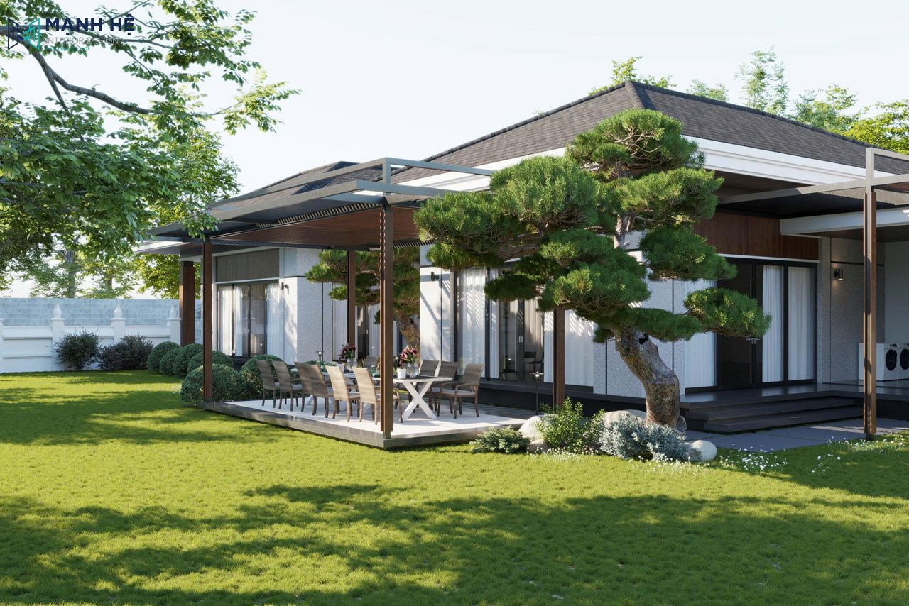 Không gian sân vườn được xem như một khu vực sinh hoạt mở, nơi Mạnh Hệ tạo nên sự kết nối mềm mại giữa nội thất ngoài trời hòa cùng thiên nhiên tạo nên cảm giác nghỉ dưỡng trọn vẹn. Với diện tích rộng rãi, khu vườn được thiết kế khoa học với mảng cỏ xanh mướt, hàng cây bonsai dáng cổ mang lại cảm giác thư thái.