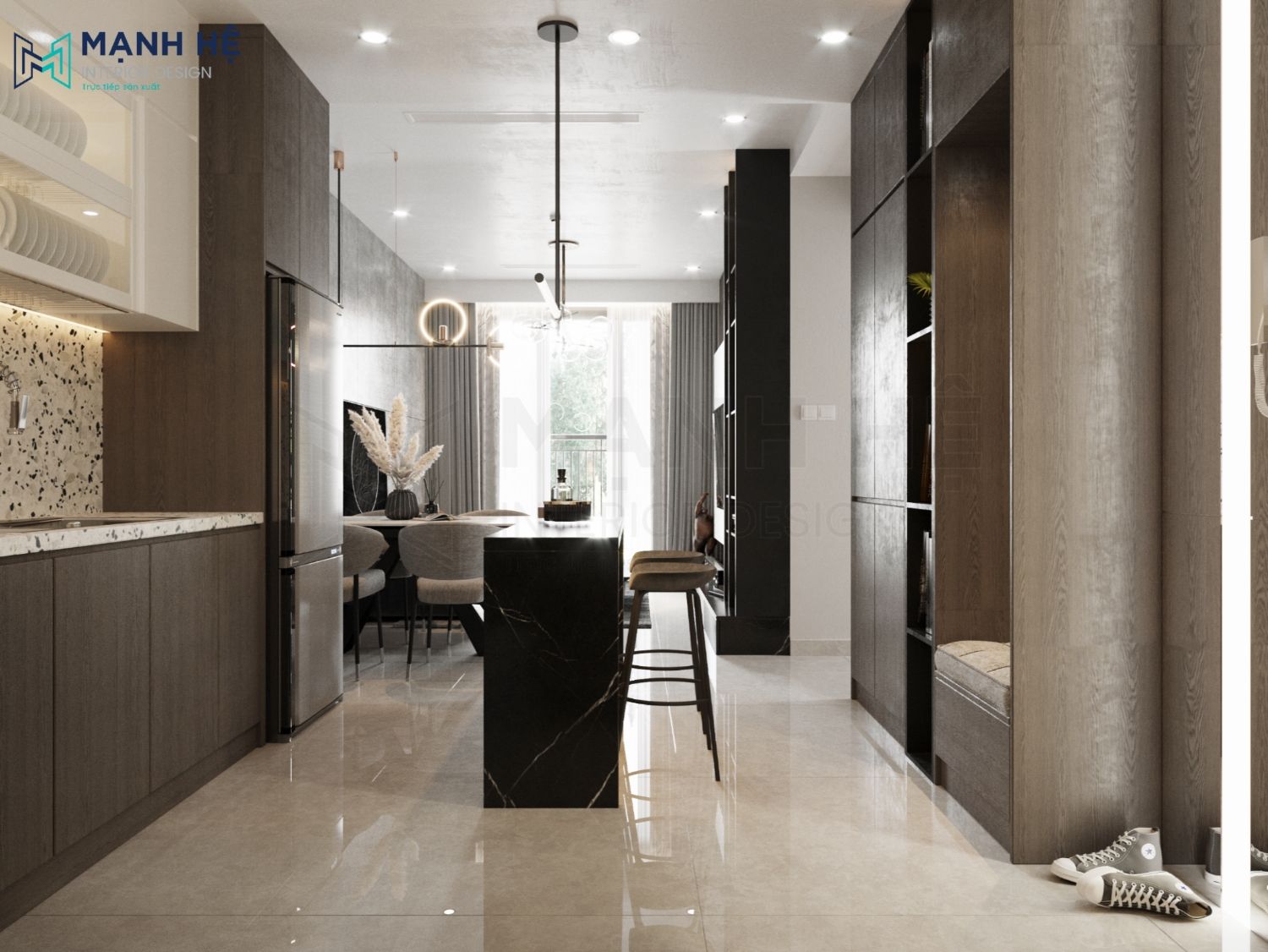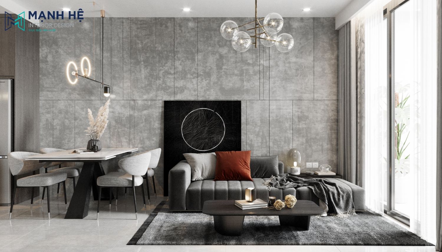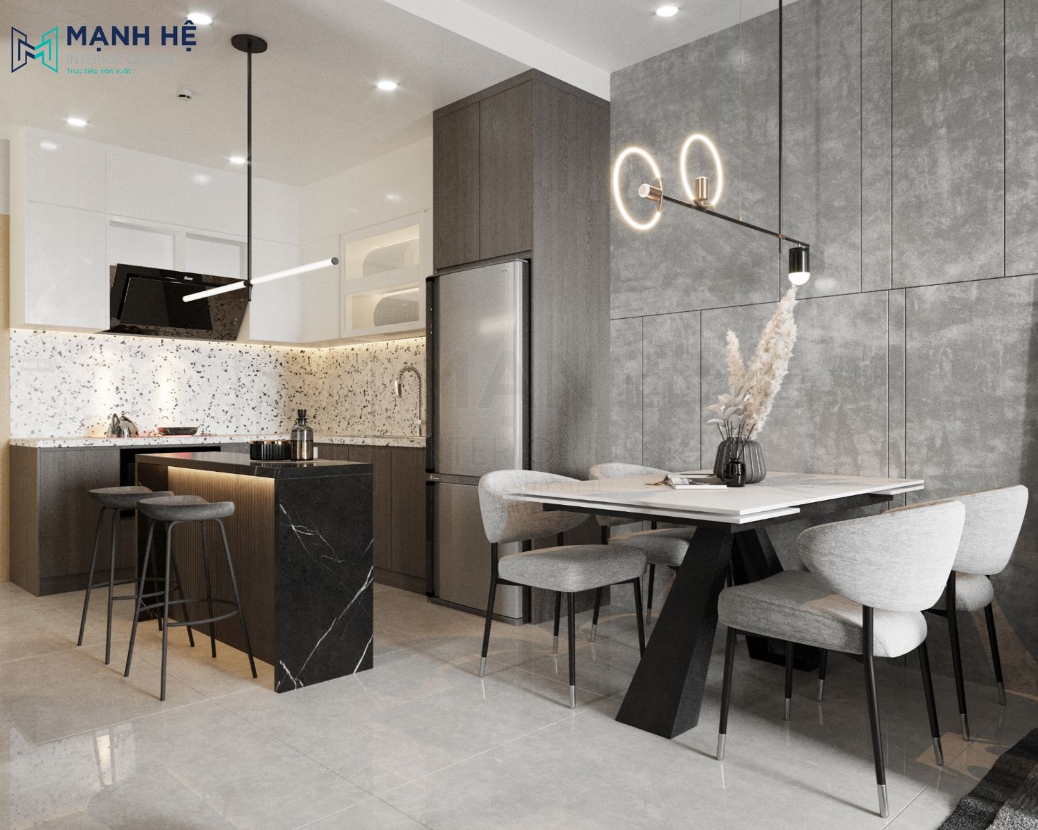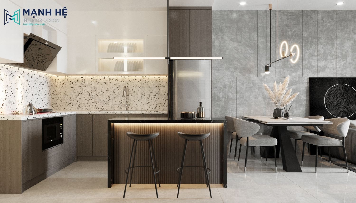 Thiết kế phòng khách liền bếp ăn với không gian mở giúp cho căn hộ trở nên thông thoáng hơn. Ở mỗi không gian đều bố trí đèn trang trí hiện đại để tạo điểm nhấn và giúp chia cắt không gian. Với tông màu trung tính, sử dụng chất liệu cao cấp, thì không cần bố trí thêm tranh ảnh để vật liệu tự toát ra sự đẳng cấp riêng của nó.
