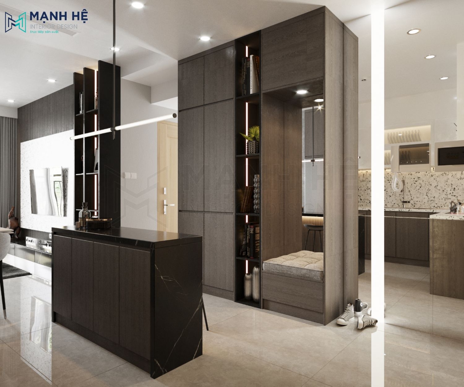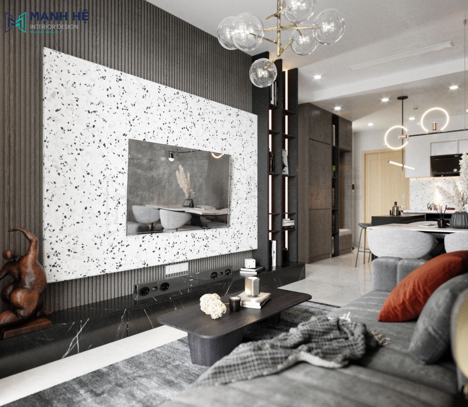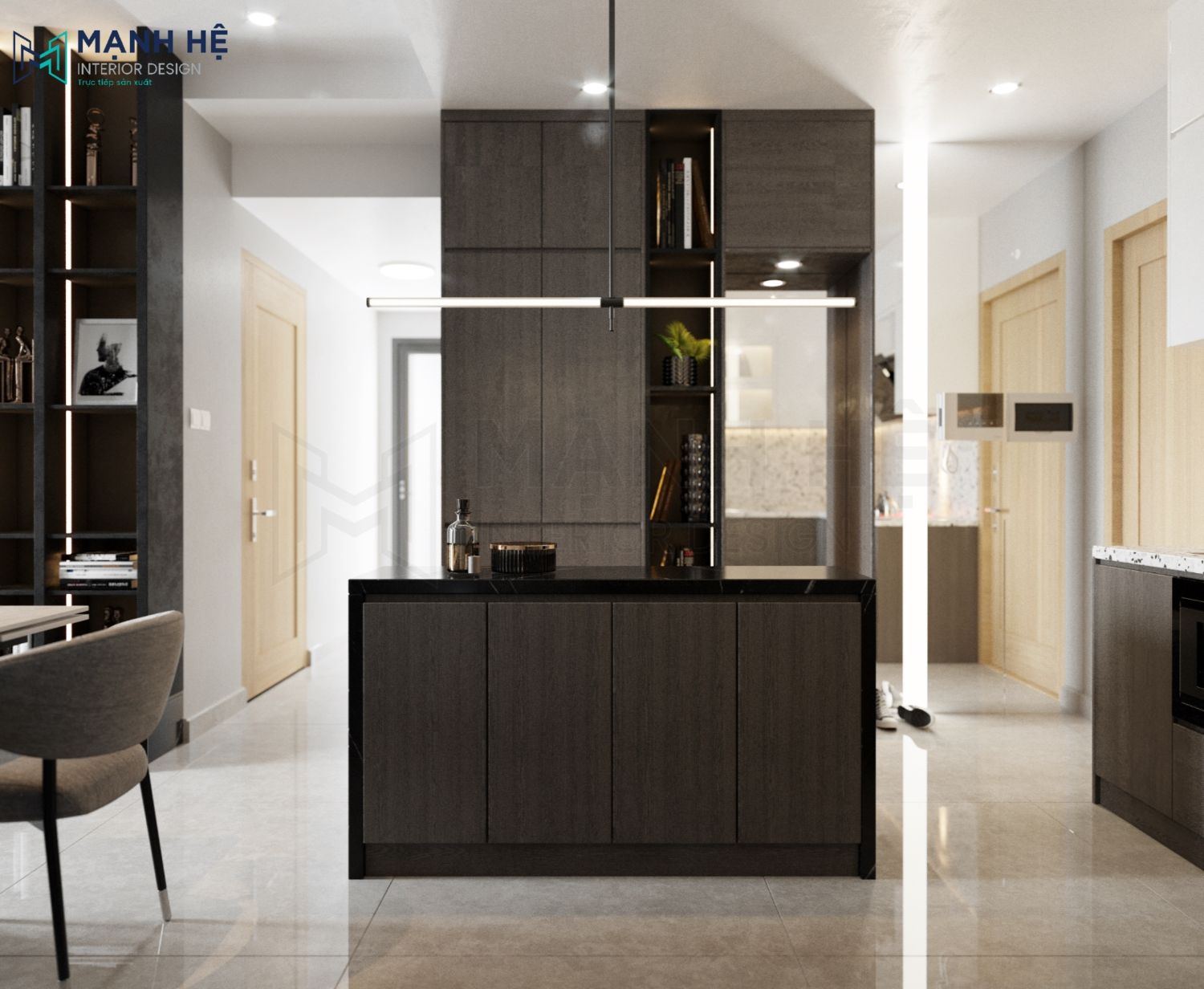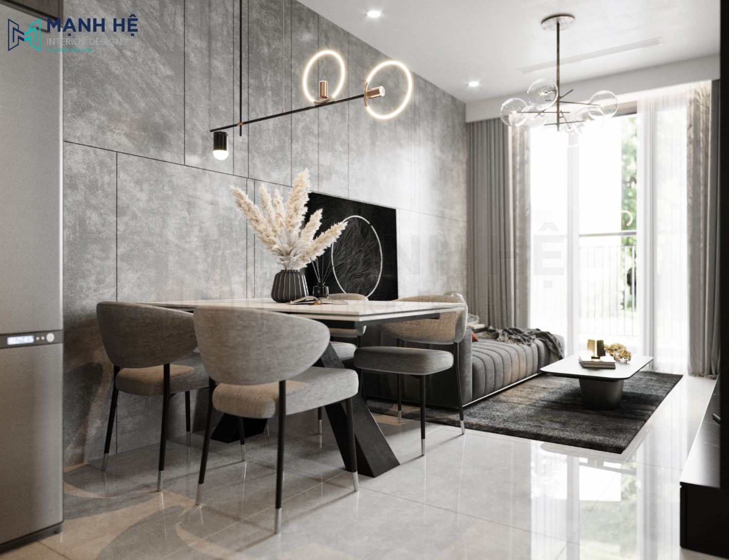 Thiết kế phòng khách liền bếp ăn với không gian mở giúp cho căn hộ trở nên thông thoáng hơn. Ở mỗi không gian đều bố trí đèn trang trí hiện đại để tạo điểm nhấn và giúp chia cắt không gian. Với tông màu trung tính, sử dụng chất liệu cao cấp, thì không cần bố trí thêm tranh ảnh để vật liệu tự toát ra sự đẳng cấp riêng của nó.
