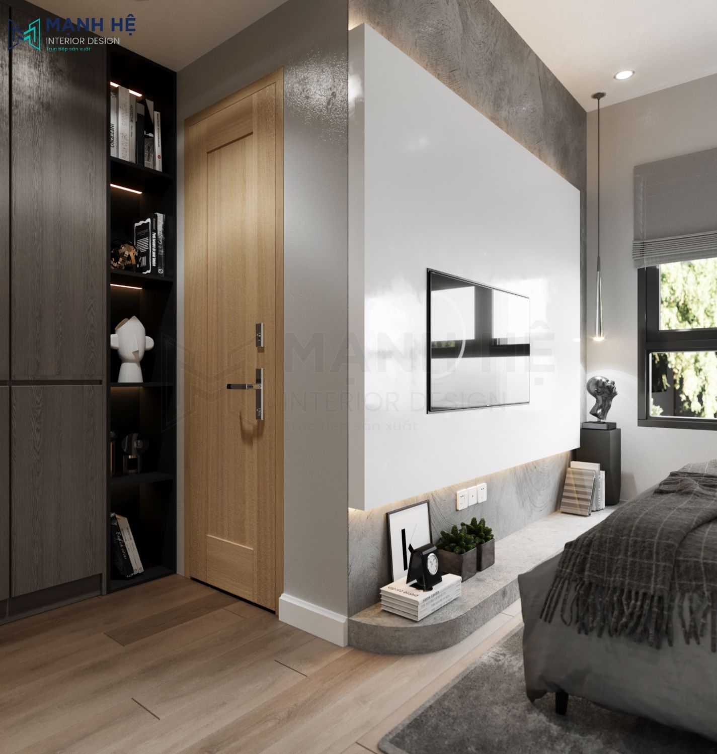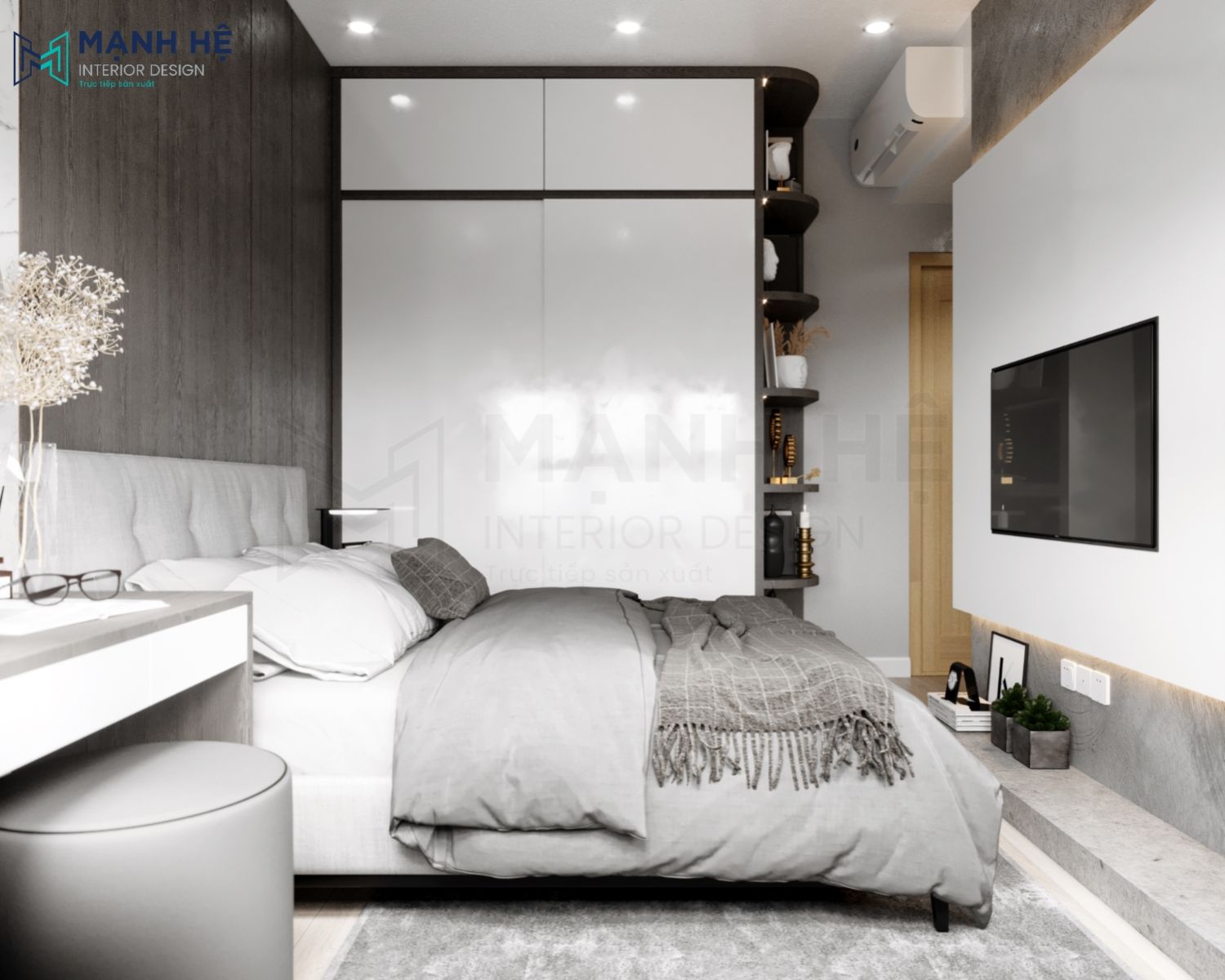 Phòng ngủ được bố trí cửa sổ lớn với rèm kéo tiện lợi, thảm trải sàn màu xám đồng bộ với căn phòng mang lại sự ấm áp. Tủ quần áo lớn có kèm kệ góc để trang trí vật dụng yêu thích.