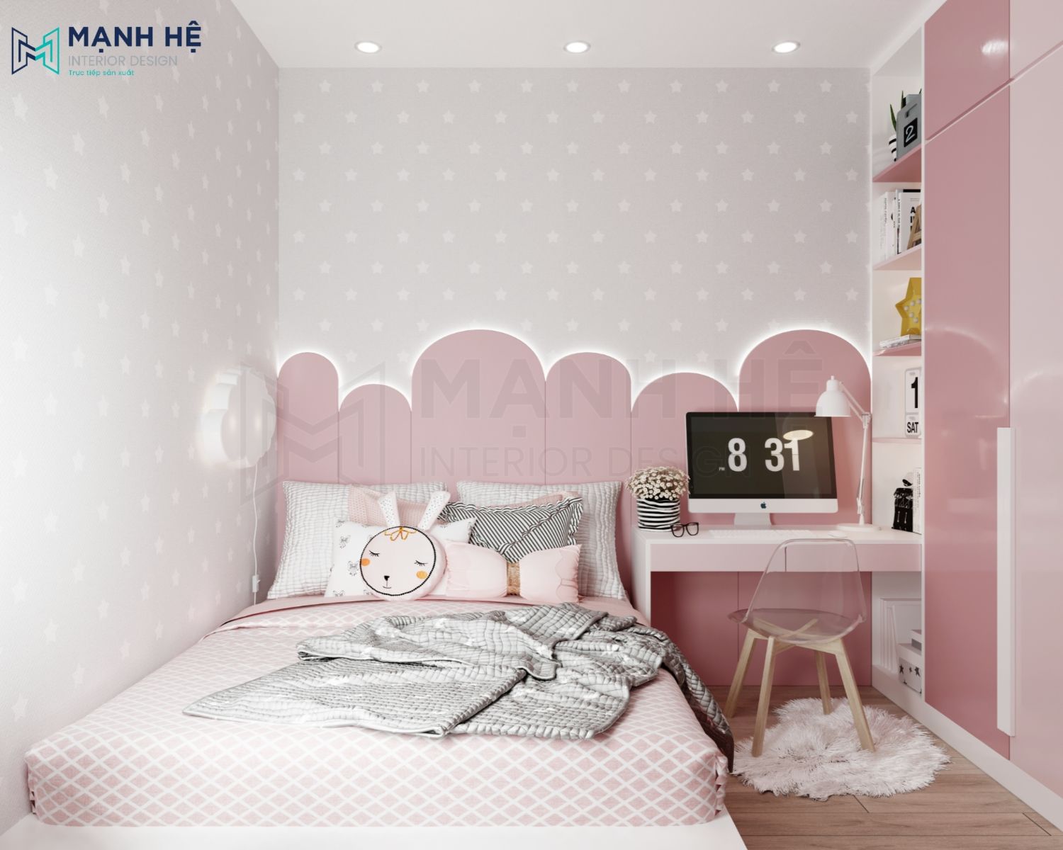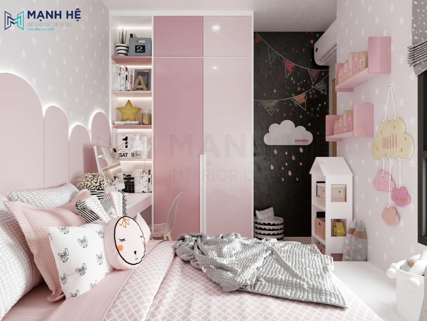 Phòng ngủ sử dụng giấy dán tường nhẹ nhàng, kết hợp với nội thất tông màu hồng đậm nhạt được phối đẹp mắt và nổi bật, vô cùng phù hợp với đa số các bé gái. Sử dụng giường bục với nhiều hộc kéo sẽ giúp bé có thêm không gian lưu trữ đồ đạc, học cách tự lập, ngăn nắp mỗi khi học tập hay vui chơi xong.